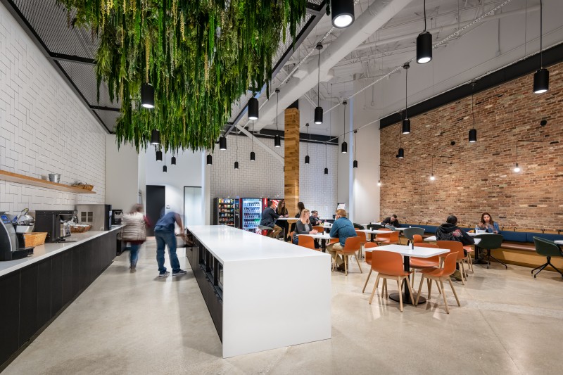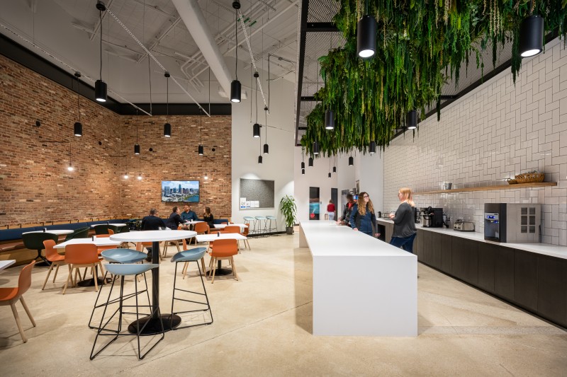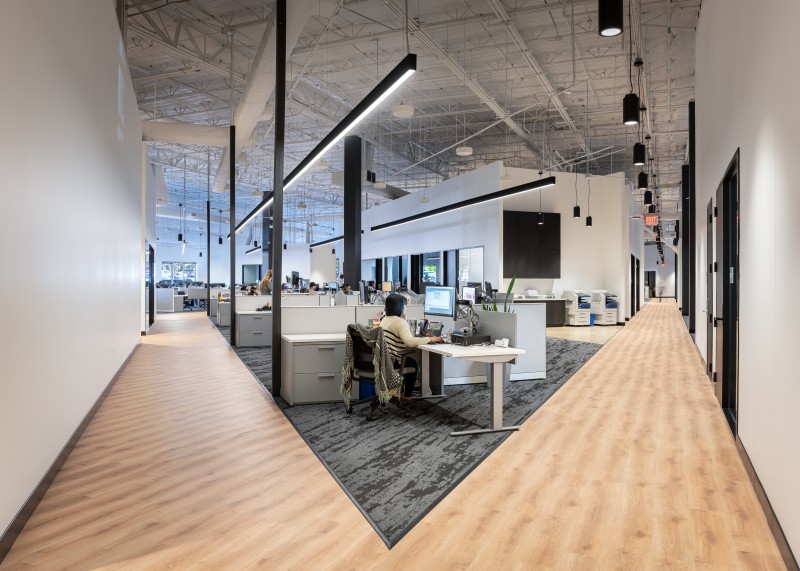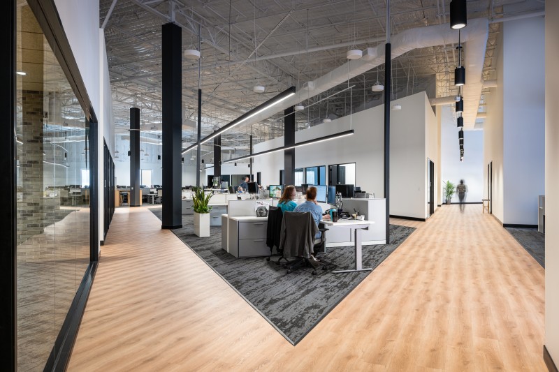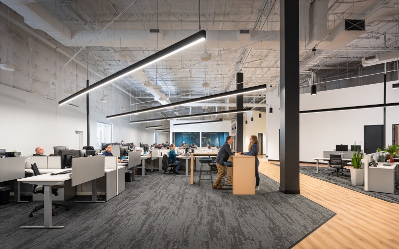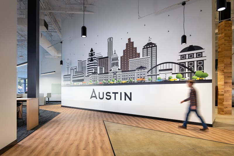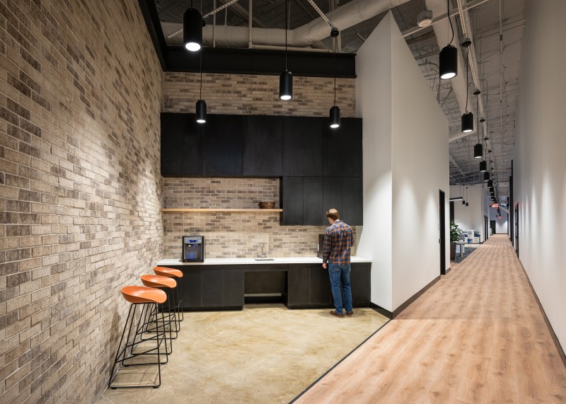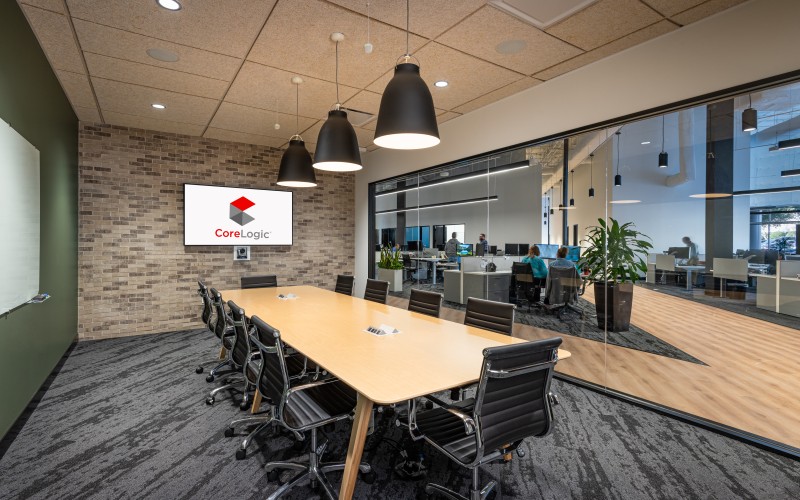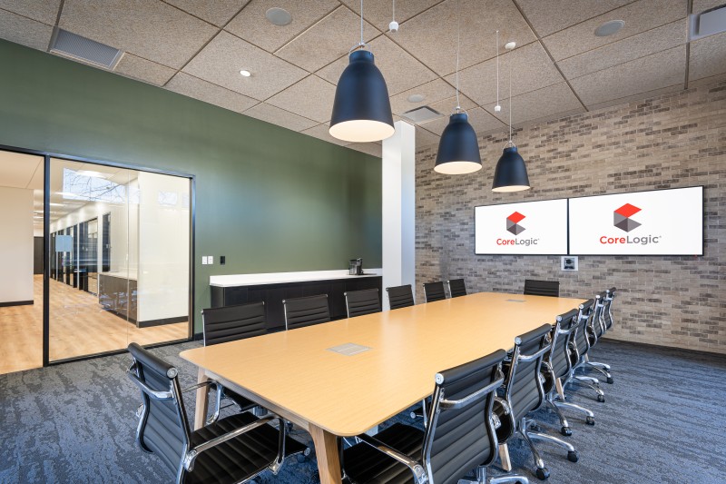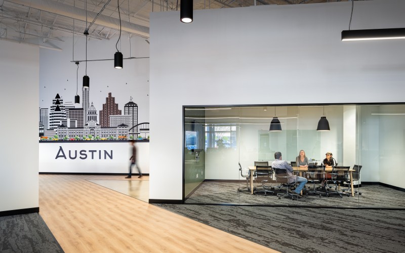 After completion of their Dallas Headquarters, CoreLogic engaged BOKA Powell to provide interior design services for several of their offices throughout the United States, from Austin Texas to, Greensboro, North Carolina to Milwaukee, Wisconsin. Their Austin office is a clever adaptive re-use of an existing warehouse allowed for a unique aesthetic with 25 foot exposed ceilings. By arranging walls of various heights, acoustical separation zones were created, giving way to a centralized breakroom all while maintaining an effective space plan that allowed for natural light to penetrate throughout. This new office environment provides access to several lounge areas, collaboration zones and an outdoor terrace.