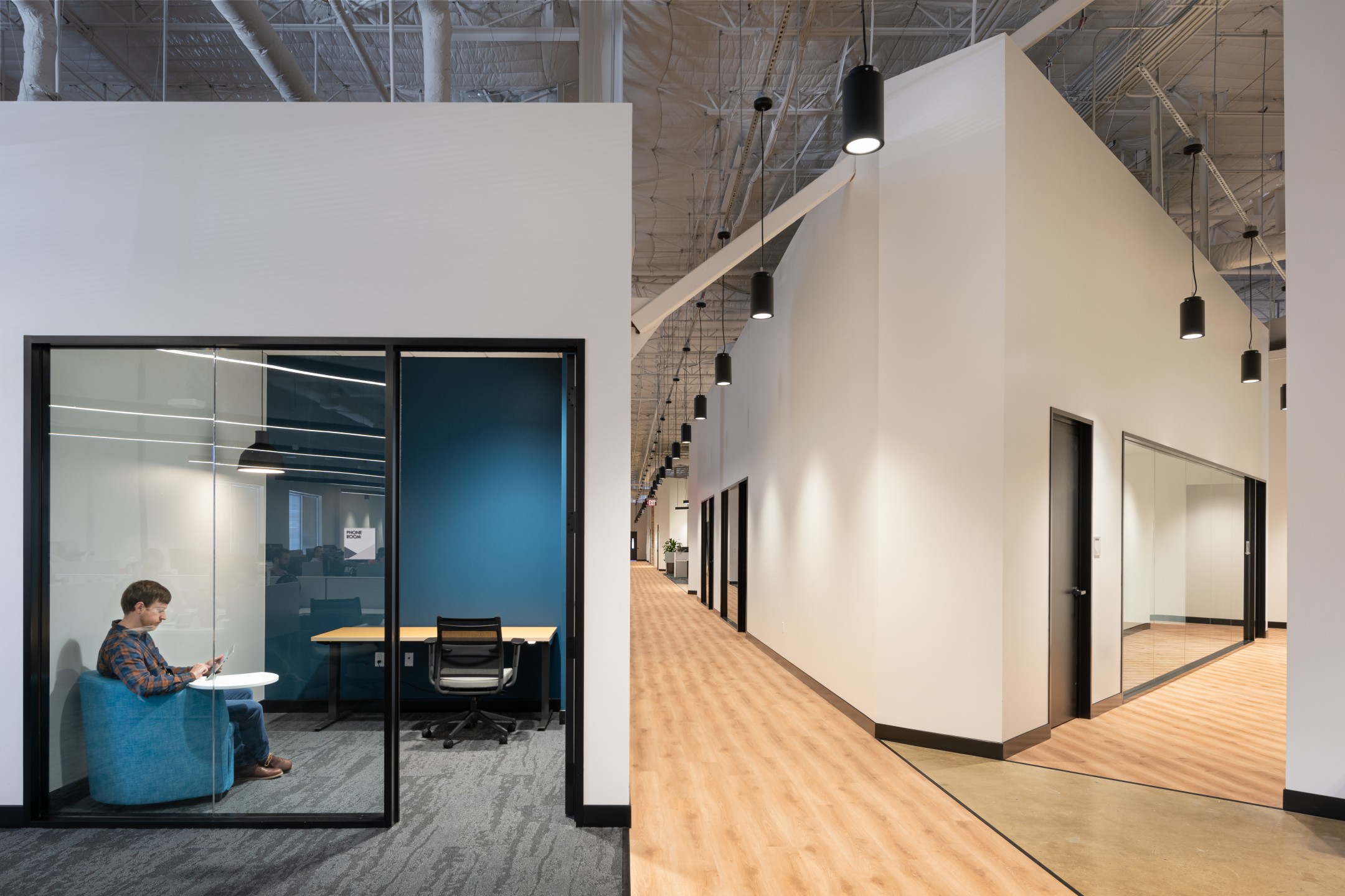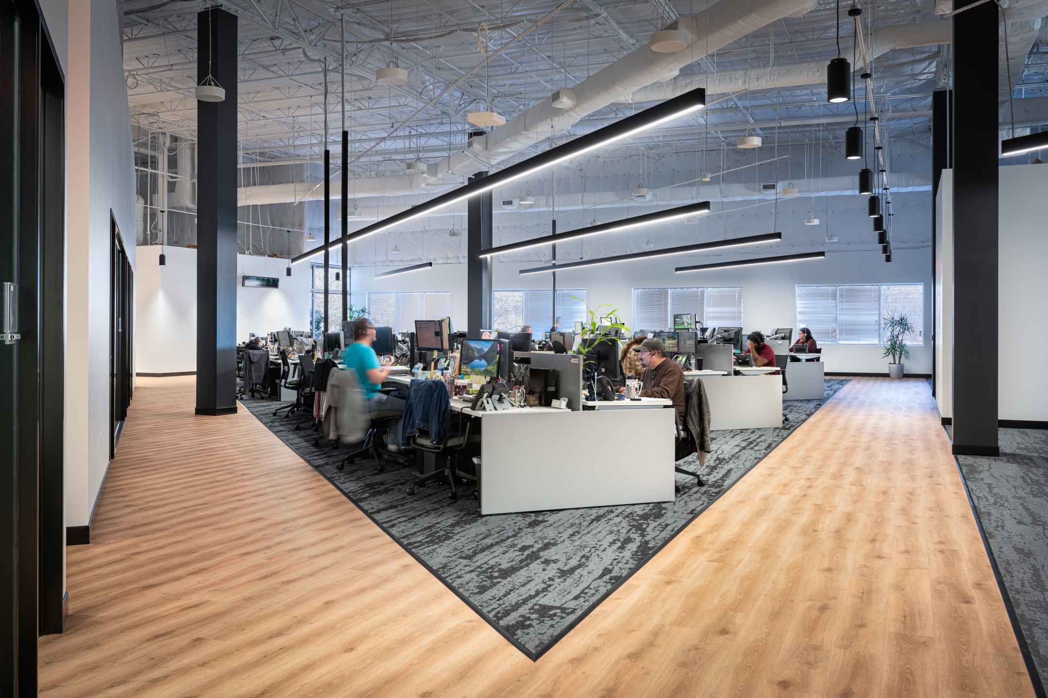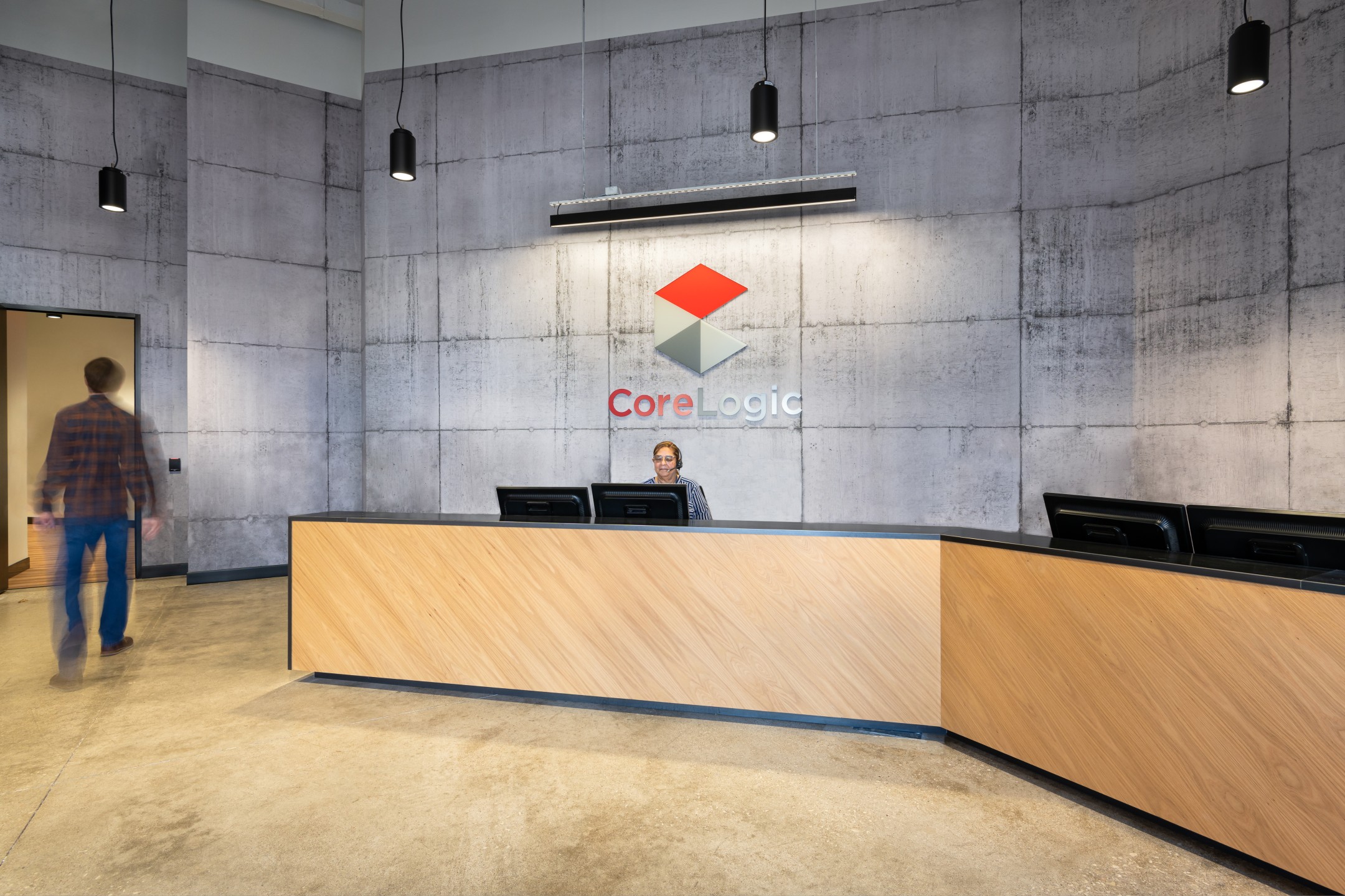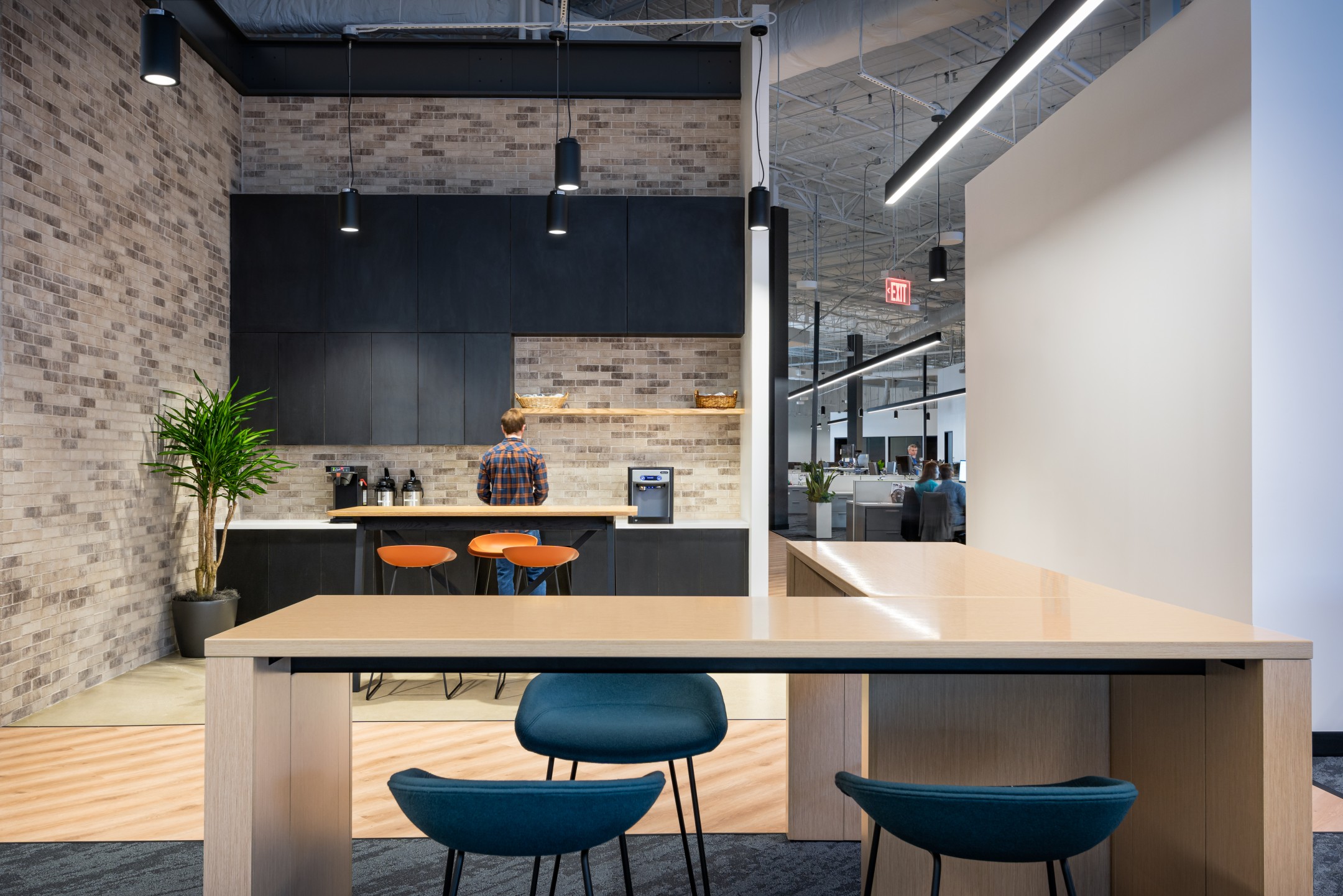 After completion of their Dallas Headquarters, CoreLogic engaged BOKA Powell to provide interior design services for several of their offices throughout the United States, from Austin Texas to, Greensboro, North Carolina to Milwaukee, Wisconsin. Their Austin office is a clever adaptive re-use of an existing warehouse allowed for a unique aesthetic with 25 foot exposed ceilings. By arranging walls of various heights, acoustical separation zones were created, giving way to a centralized breakroom all while maintaining an effective space plan that allowed for natural light to penetrate throughout. This new office environment provides access to several lounge areas, collaboration zones and an outdoor terrace.