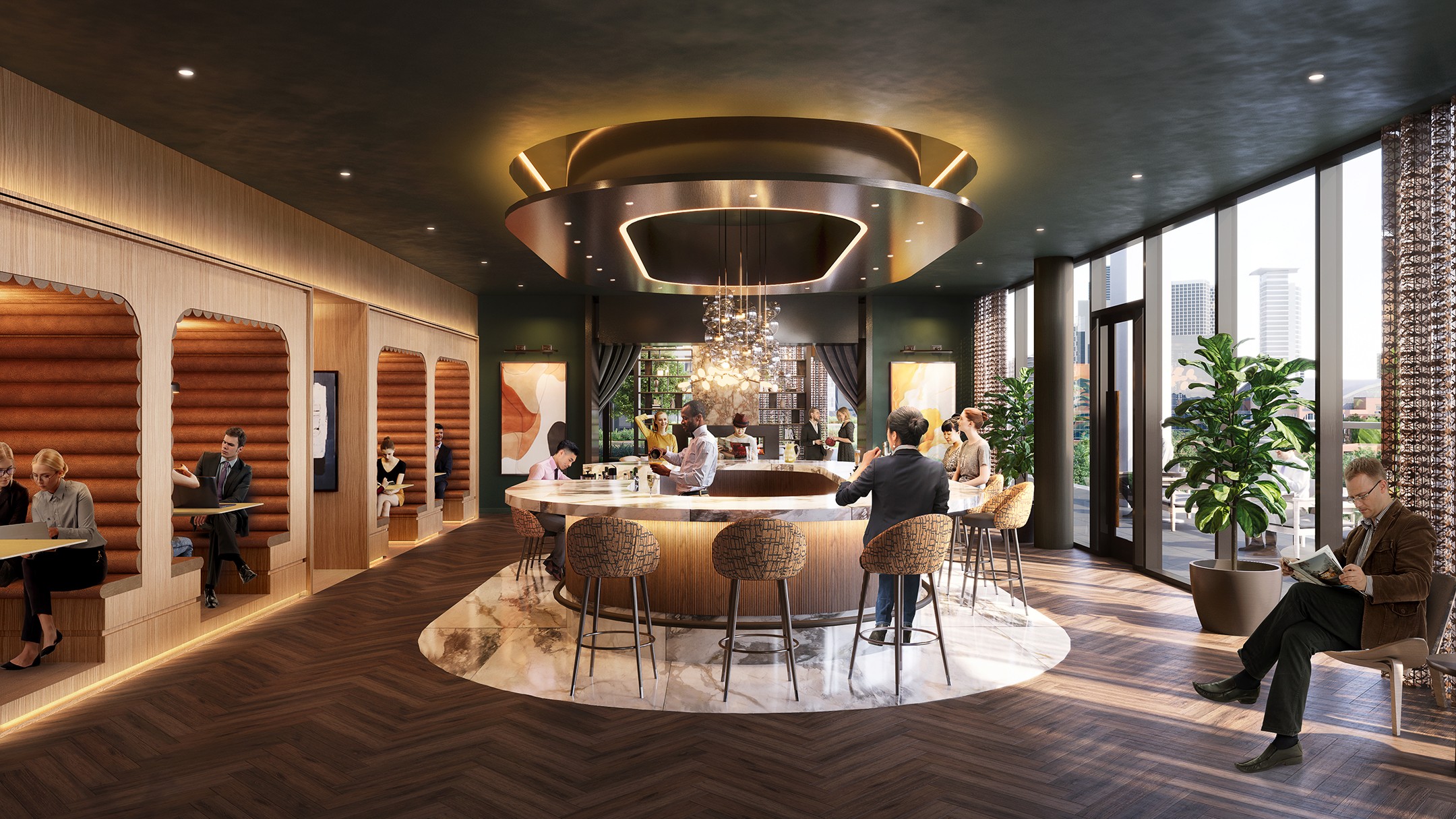 BOKA Powell’s architectural response is shaped by that overlap. The office component is defined by a robust amenity offering, pairing workspace with conference and training rooms, executive board and dining spaces, indoor and outdoor fitness areas, locker and wellness rooms, terraces, and ground-floor food and retail. The hotel and residential program extends the same logic, adding restaurant and bar space, meeting rooms, a ballroom, pool deck, spa, hydrotherapy, and wellness-centered services that position the development as more than a single-purpose address. Materially and experientially, the project draws on the Chalk Hill name and its connection to the site’s Austin Chalk formation, using landscape, terraces, and elevated outdoor spaces to keep nature present within a dense urban setting. Proximity to the Katy Trail strengthens that idea by linking the towers to a broader public realm rather than isolating them from it. Walkability, access to neighborhood amenities, and a layered indoor-outdoor experience all help define the development’s character, which is increasingly important in projects that ask people to work, stay, gather, and live in the same place.