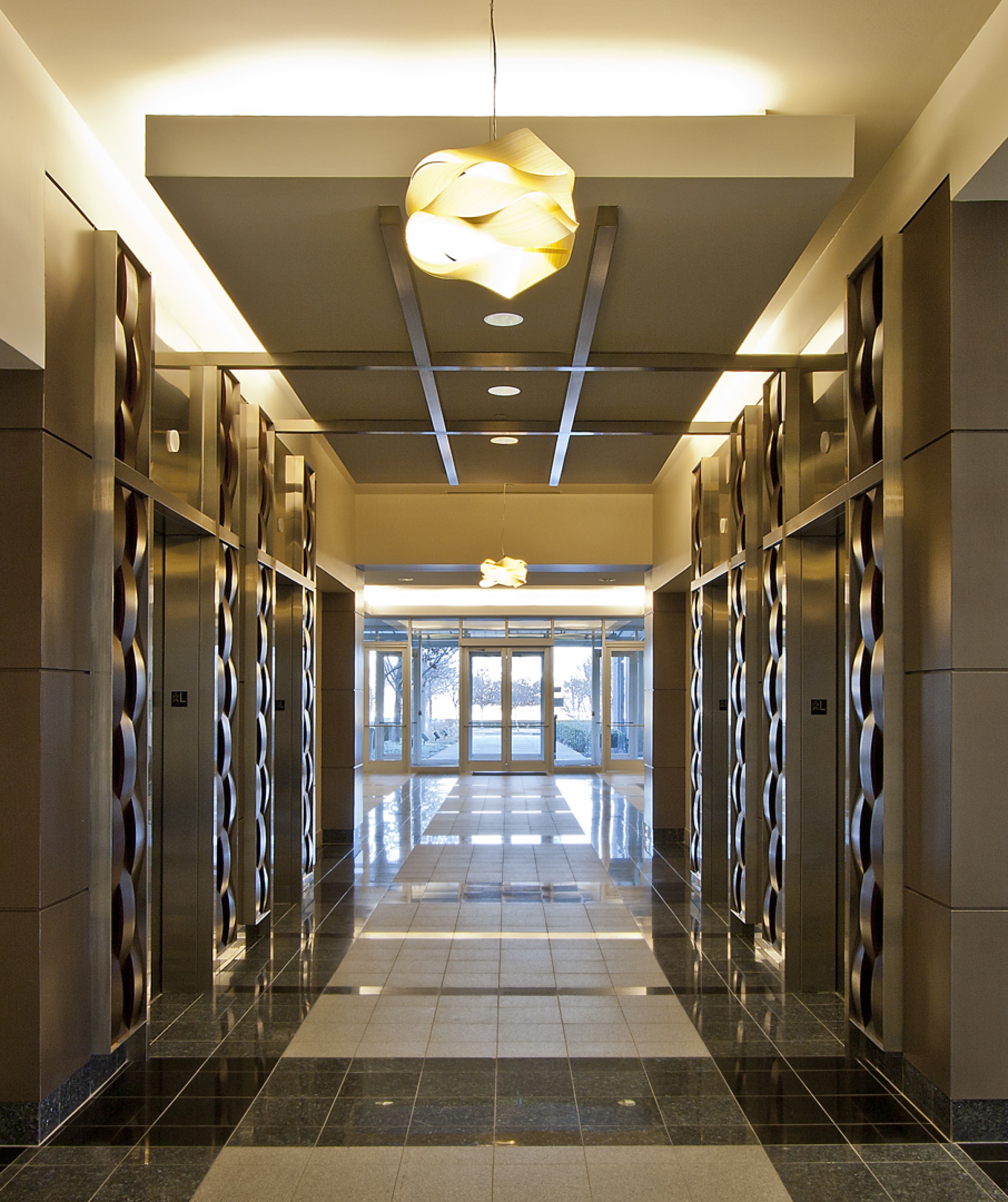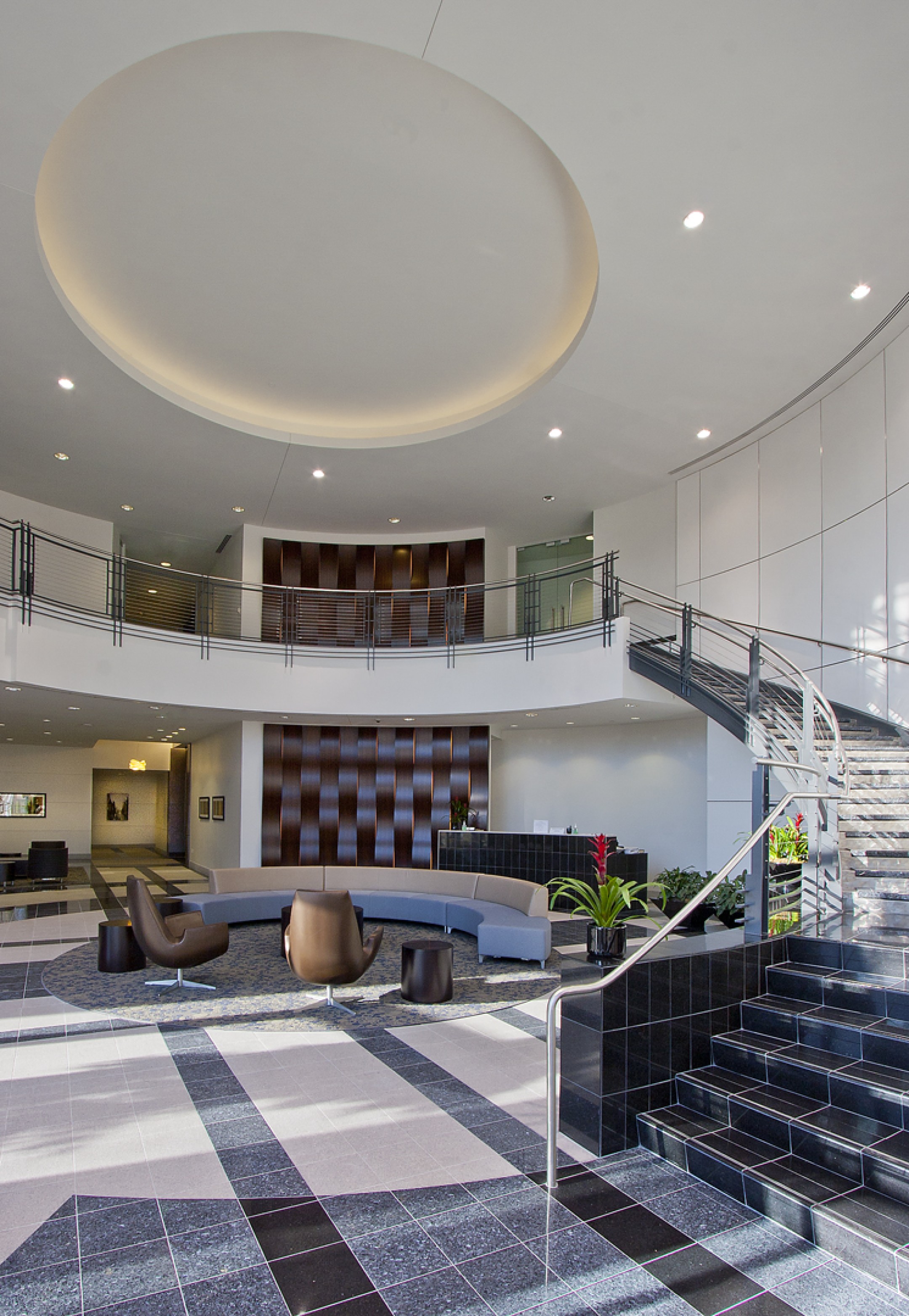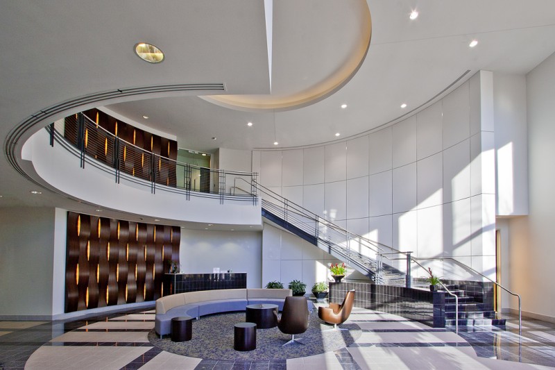 Spatial organization was the guiding principle to the design of Computer Associates’ Dallas office. The office consists of 130,000 SF of open-plan space including a dining room, training rooms, and a fitness center. An open-ceiling plan was utilized to provide added height above the systems furnishings. This industrial look is carried throughout the space in detailing, furnishings, and finishes including a custom-designed cowskin laminate. A tightly organized block of core elements and accompanying circulation path establish continuity from floor to floor, set off by changes in color, finishes, and specific work environments.