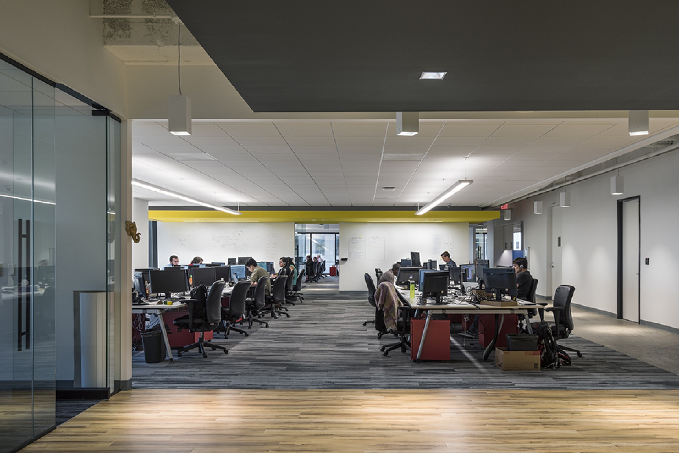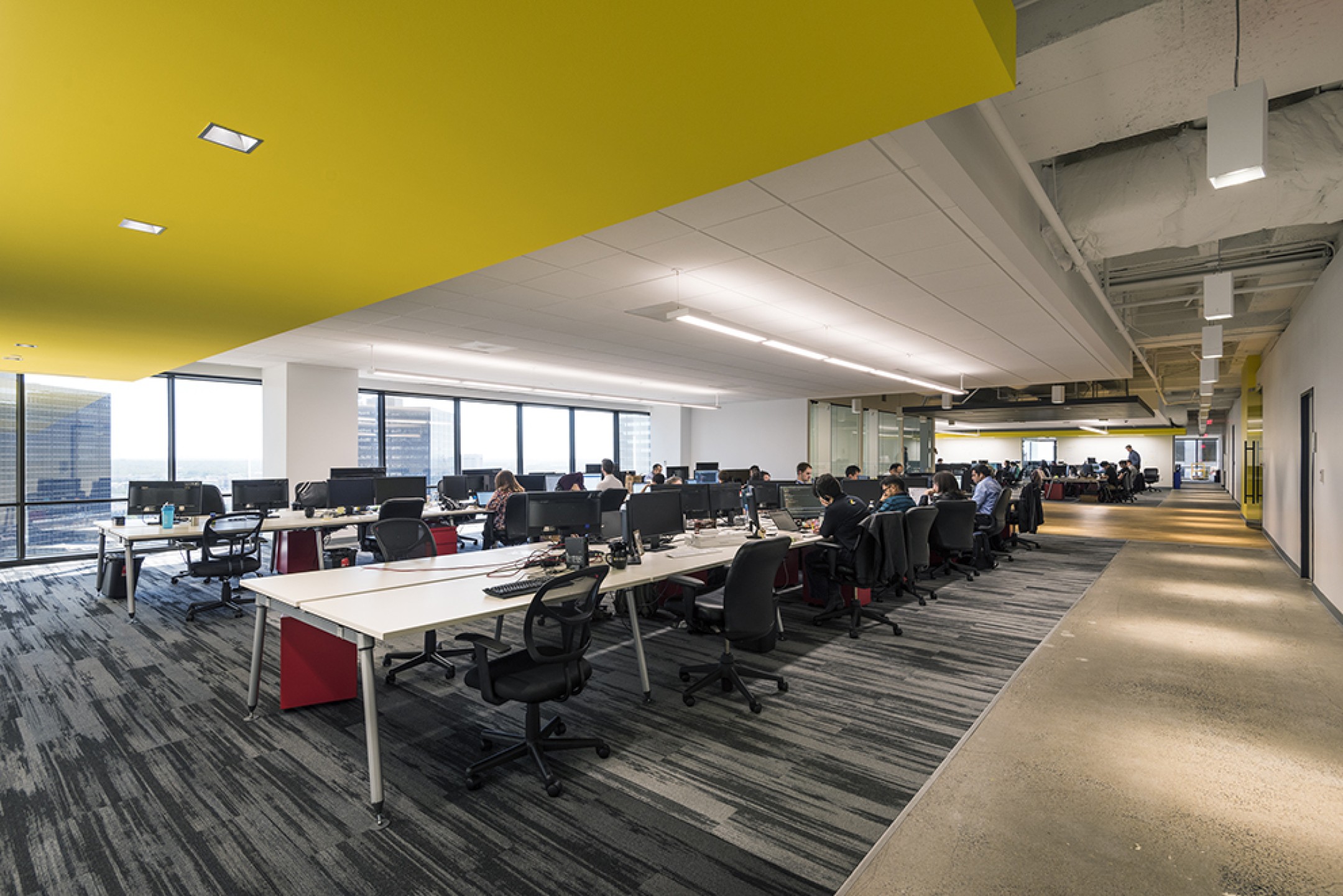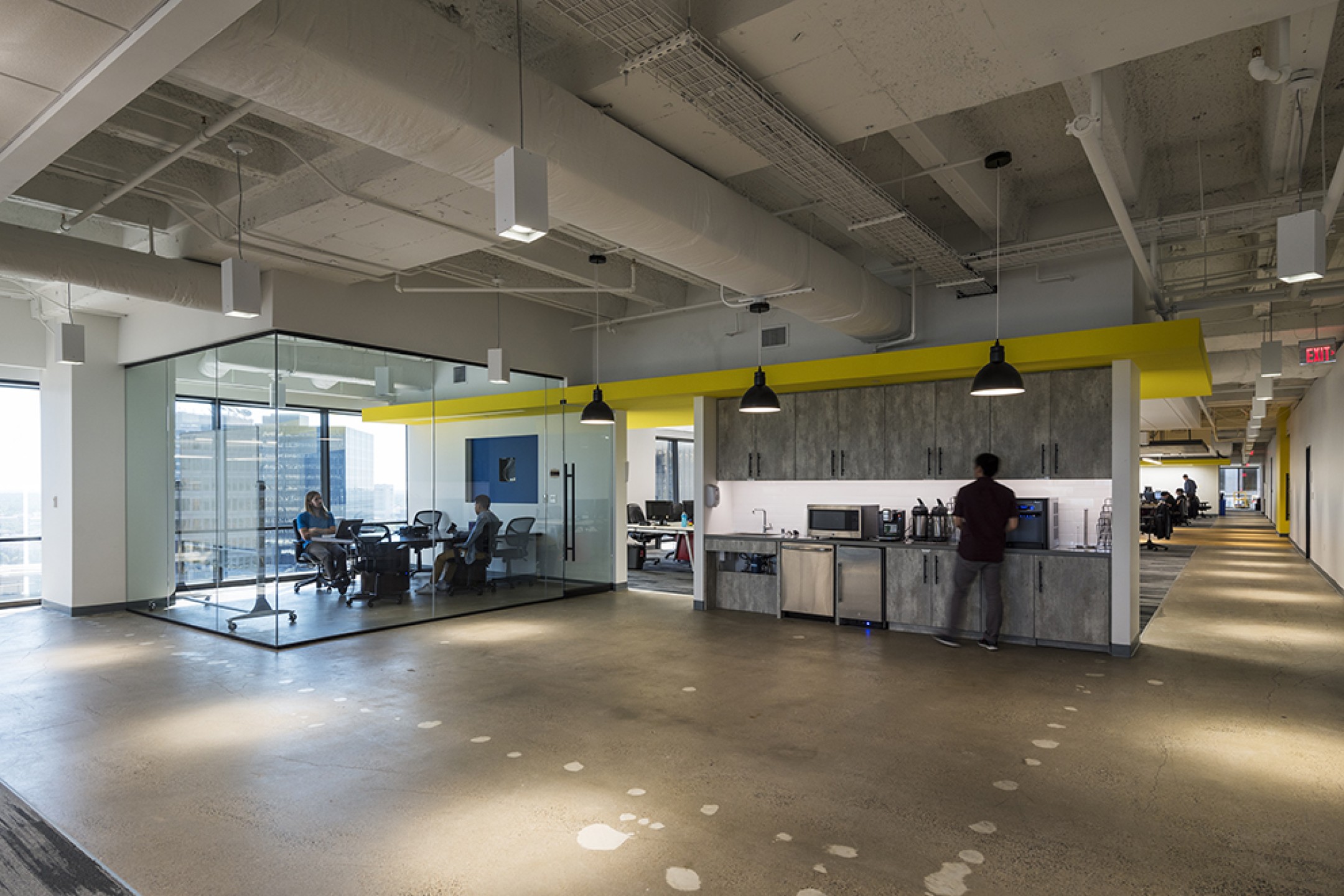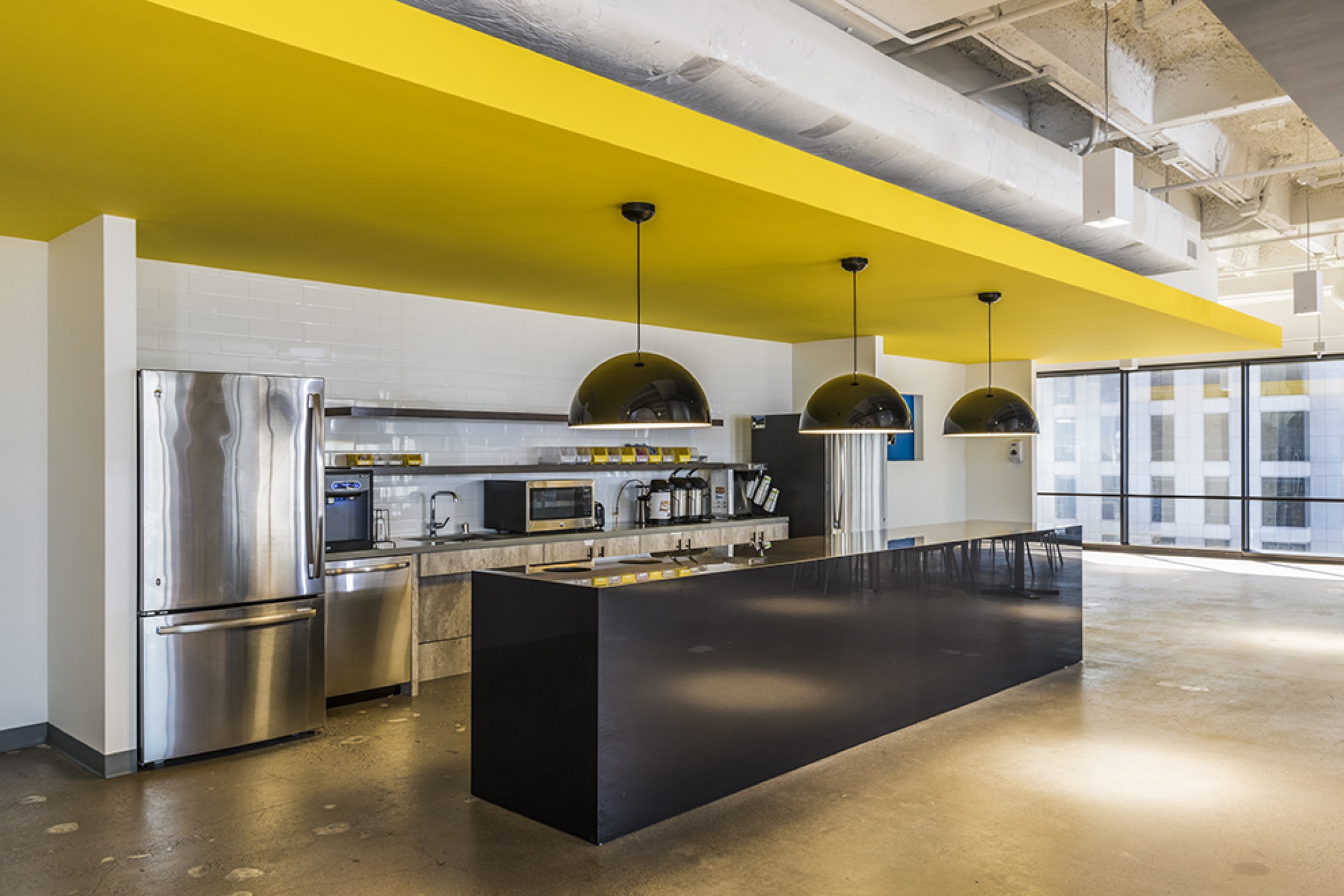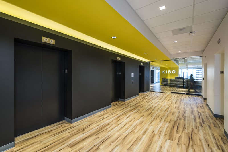 Kibo’s name is appropriated from the summit of Mt. Kilimanjaro, the highest peak on the African continent. The e-commerce firm, part of the Vista Equities portfolio, wanted a fun, energy-filled space. A bold yellow wall above the reception desk greets guests. The stone desk with its many striated layers symbolizes the many steps and plateaus that must be climbed to reach the pinnacle of business and life.