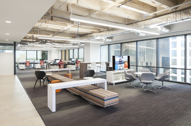 Set on four and a half floors, Omnitracs’ sophisticated 106,612 square-foot office at 717 N. Harwood houses over 500 employees. The space tells a powerful story of the company’s journey, and celebrates its new location in downtown Dallas. Designers sought to design a creative space that is sophisticated, timeless, and collaborative.