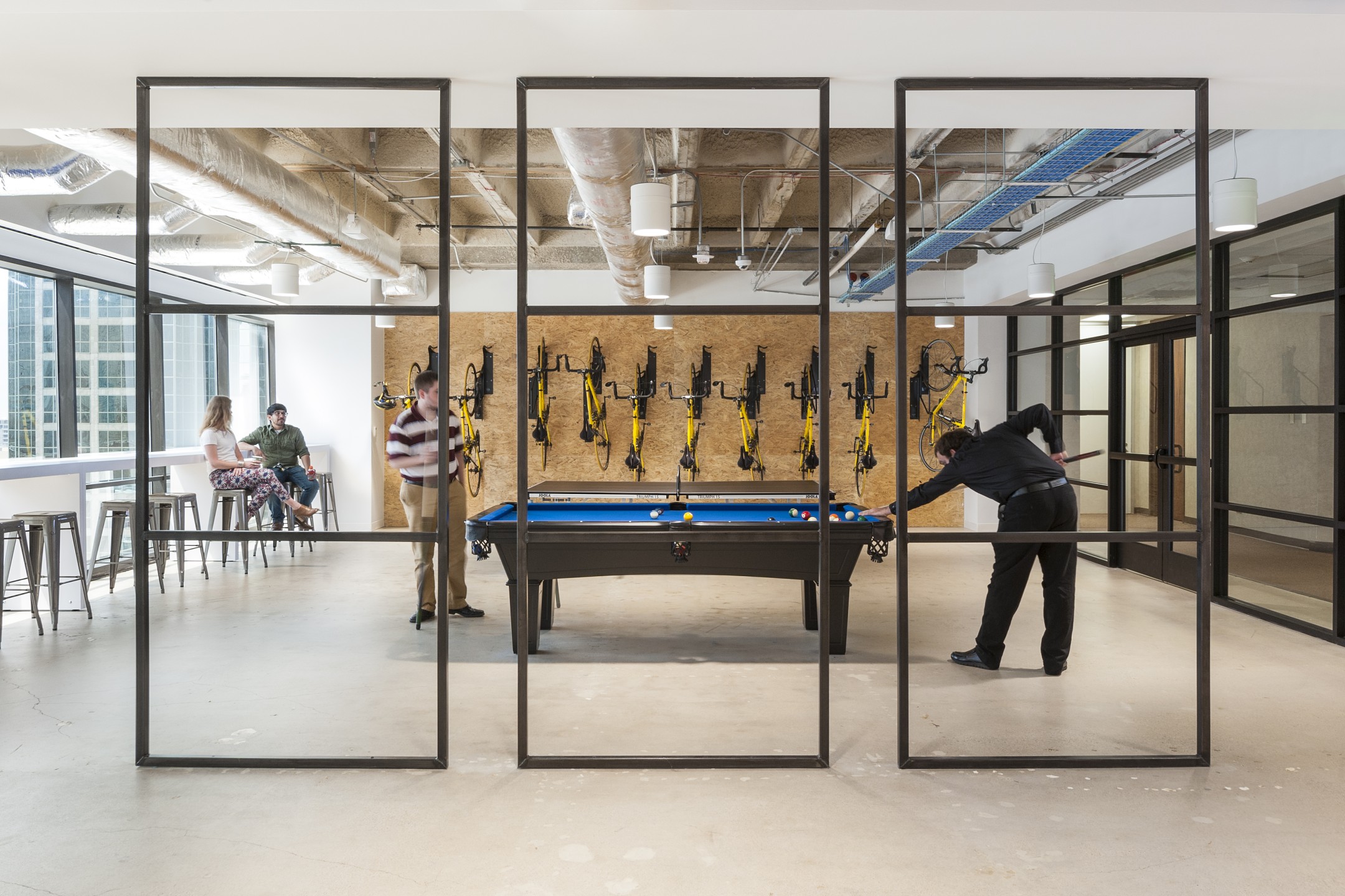 Each level features a similar floor plan, creating continuity with gathering spaces in the center and coffee bars that serve as touchdown spaces for staff. Open workstations, lounge spaces, huddle rooms, and ubiquitous marker boards encourage teamwork. The Pit Stop, an expansive dedicated lounge space, is divided into three main areas: ping-pong and pool table, break room (The Filling Station) with high-top bar and picnic tables, and a collaborative lounge with soft seating and wall-mounted racks for bike storage. Employees may store their bikes during the day or may borrow company-provided bikes.