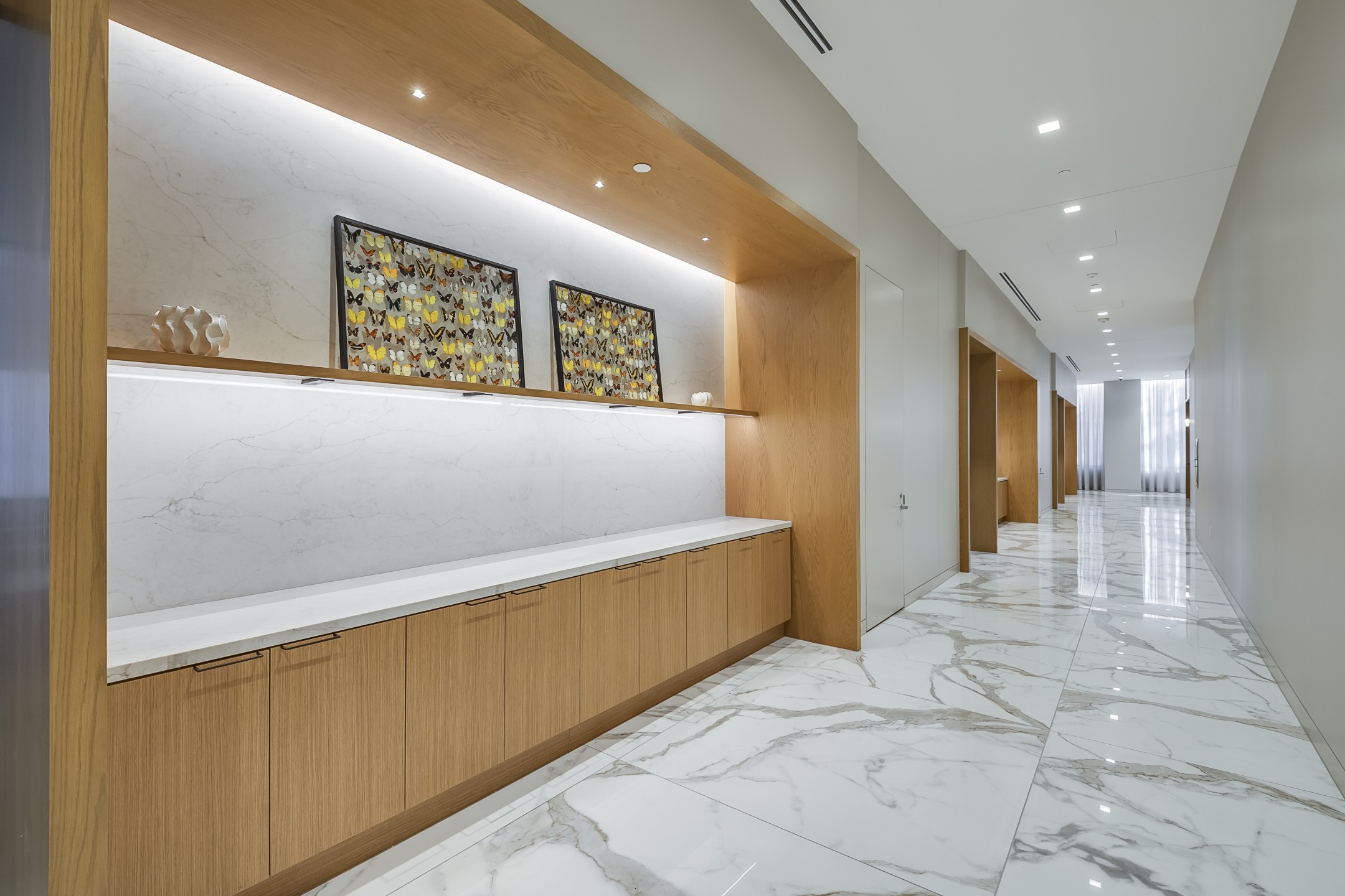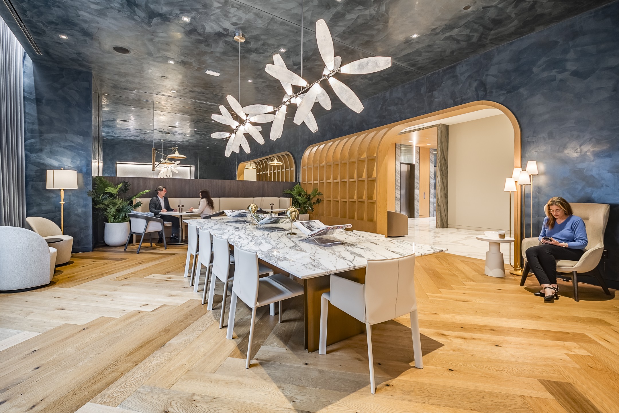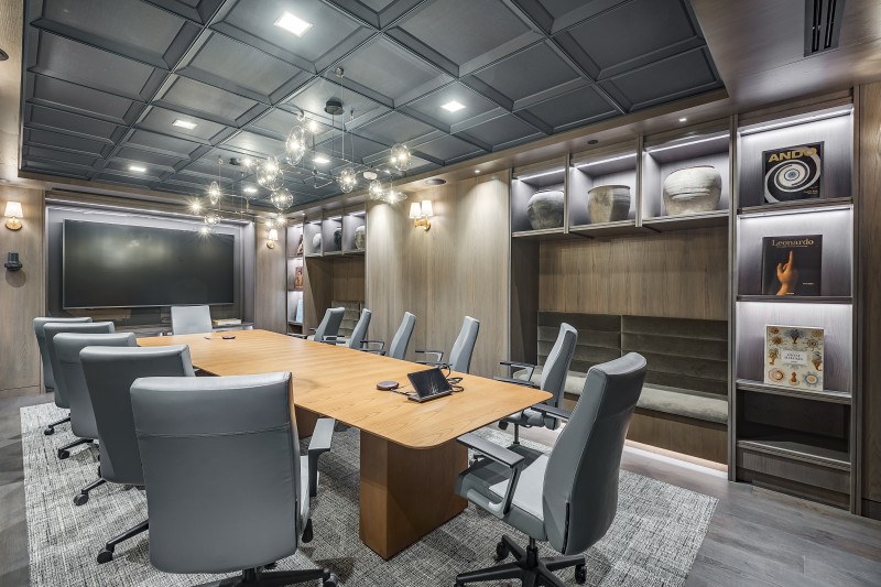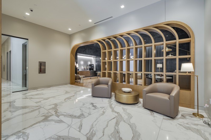 Dubbed as the “jewel box” of the project, the deep-toned and richly detailed boardroom sits tucked away on the first floor, ready to be discovered by tenants. Throughout the tower, the interiors blend elegance with a contemporary sensibility. Platino Quartzite and rich navy tones bring a sense of calm and sophistication, while plaster-coated walls add depth and warmth, subtly enhanced by cove lighting throughout the space. What was once a dated palette of pink granite and cold stainless steel has been transformed into an inviting, curated environment. With a scope spanning the basement, first, second, and third floors, the final Interior of One Galleria Tower balances polish and comfort, contributing to a feeling of refined hospitality.