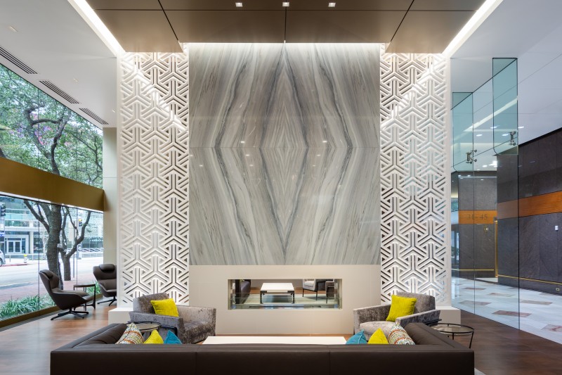 The renovation took an old ground-floor banking suite and converted it into a tenant amenity space with coffee, Wi-Fi connectivity, lounge, privacy, a fireplace, and a conference room. A new grand entrance that opens onto a large media wall leaves a positive impression, as does the scent of coffee and the sound of smooth beats, which elevate the arrival experience.