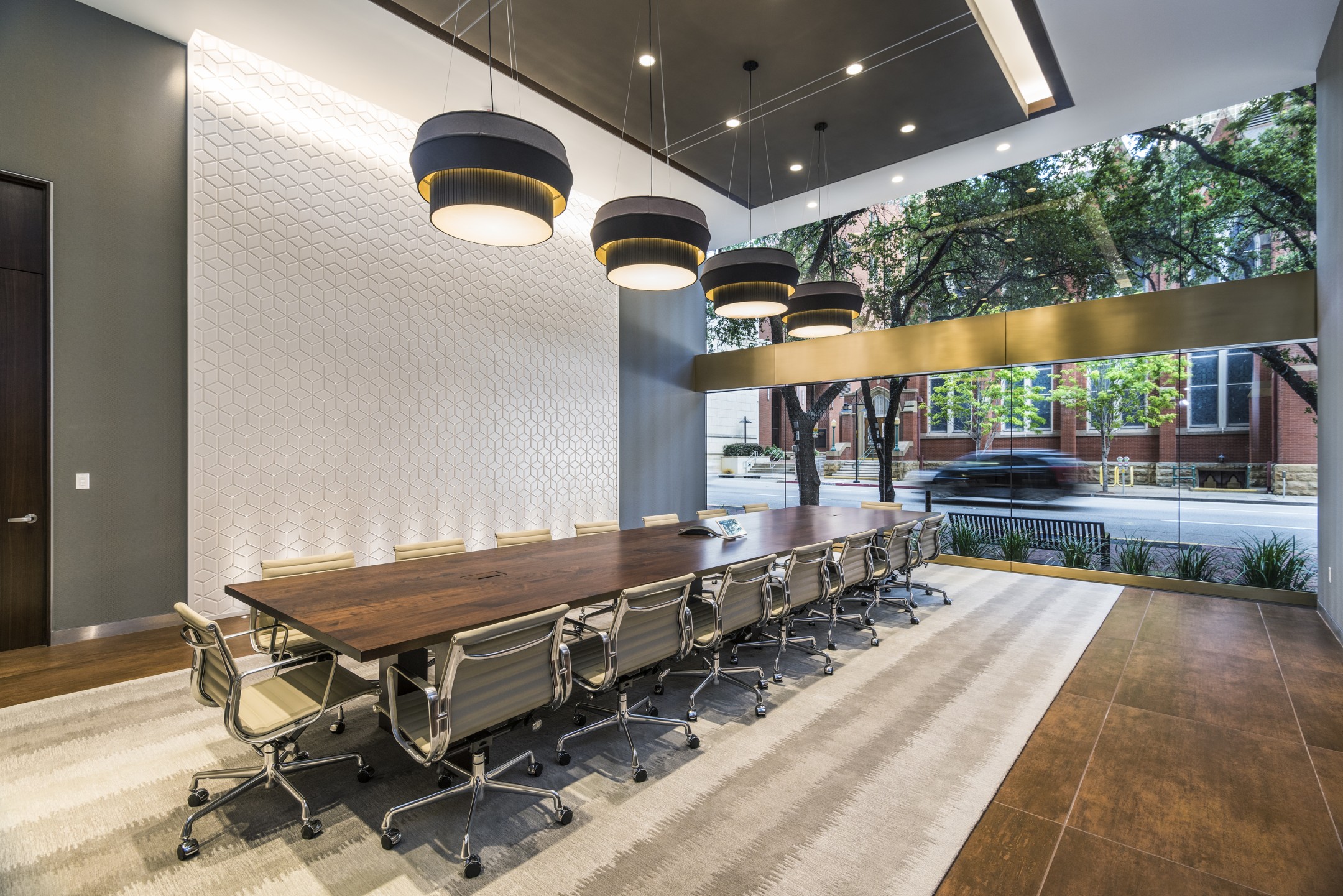 The project entailed renovating the arrival and lobby experience while working within the existing building language and aesthetic. A revitalized front entrance was created by adding a grand porte-cochere, clearing the grounds, and incorporating a coffee shop at the ground level. This renovation connects the building to the pedestrian space at the corner of North Akard and San Jacinto by offering a drop-off, outdoor seating, and covered pedestrian routes, all of which serve to energize the street level.