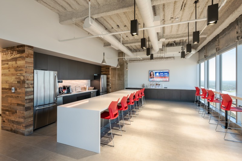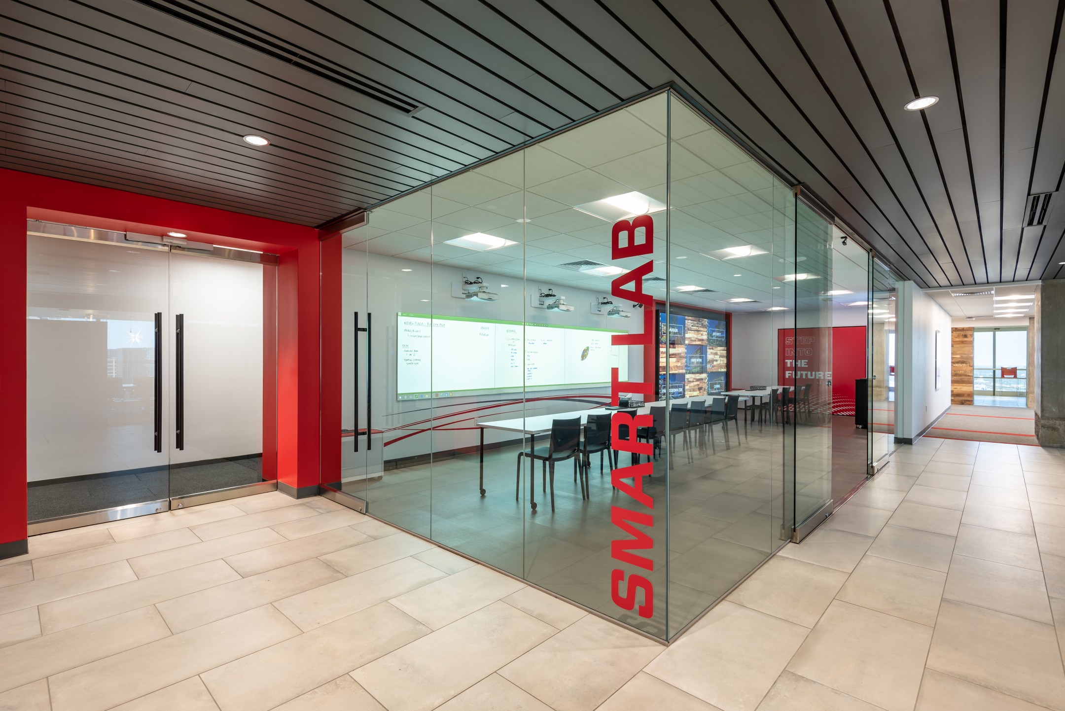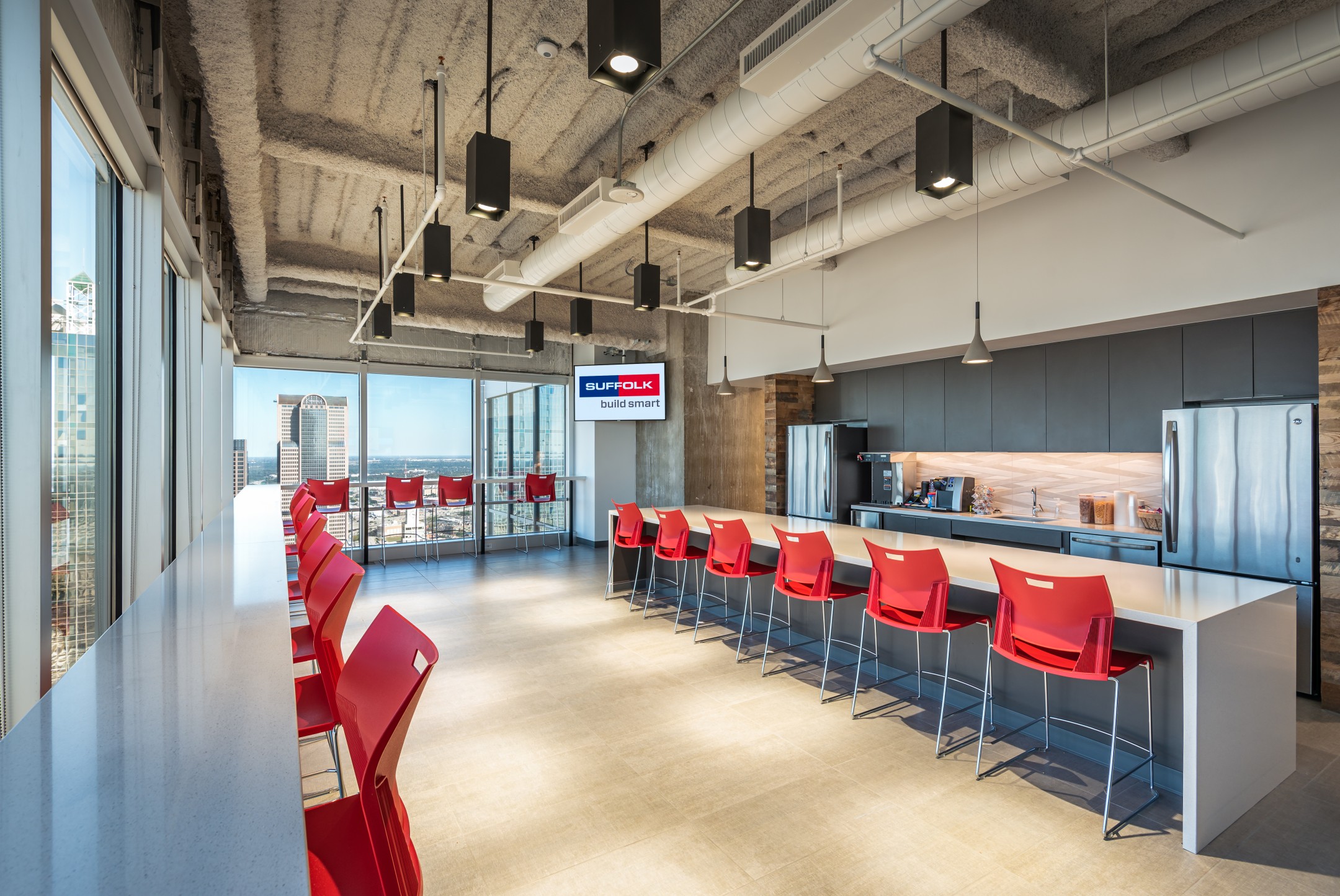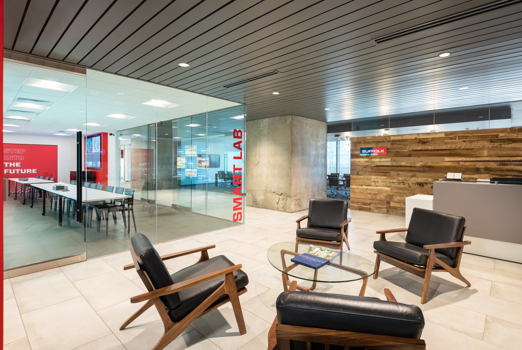 Located right off the lobby, the Smart Lab includes wide-format projection screens and teleconferencing tools to facilitate discussion. Notes are then captured and stored in Suffolk’s cloud system. Design features include metal ceiling panels that emphasize the company’s forward-thinking approach, as well as open-structure ceilings and exposed columns that highlight the building systems. Wood tones and accents and specialty lighting throughout the space add warmth and sophistication.