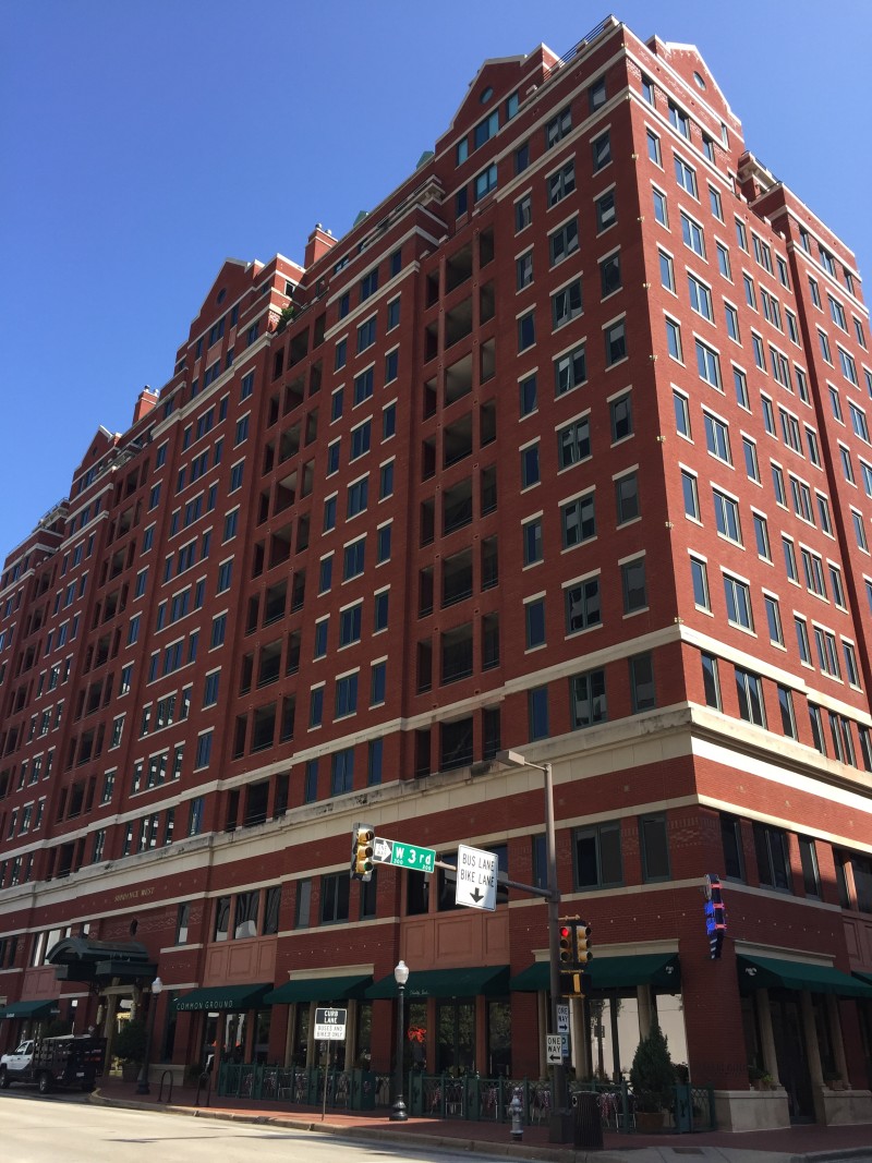 The building has four distinct façades. On Throckmorton Street, its full height features red brick with white cast stone trim and a green metal roof. On Houston Street, two-and three-story turn-of-the-century façades have been replicated. The façades on 2nd and 3rd Streets give the impression that there are four separate buildings facing each street. Each portion of the façade steps down to make the transition from the 12-story apartment block to the two-and three-story pedestrian scale of retail shops, theatres, restaurants, and a bed and breakfast.