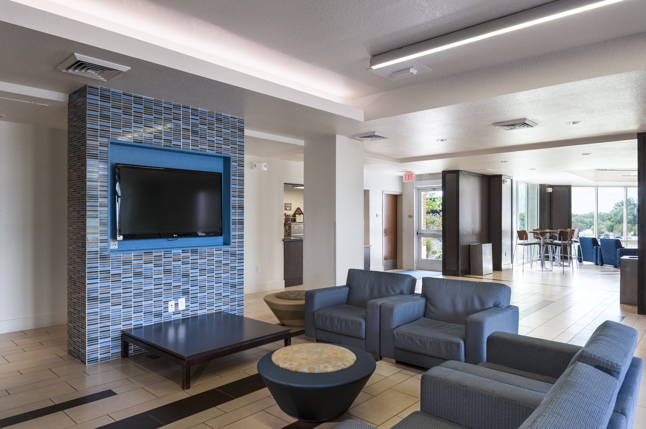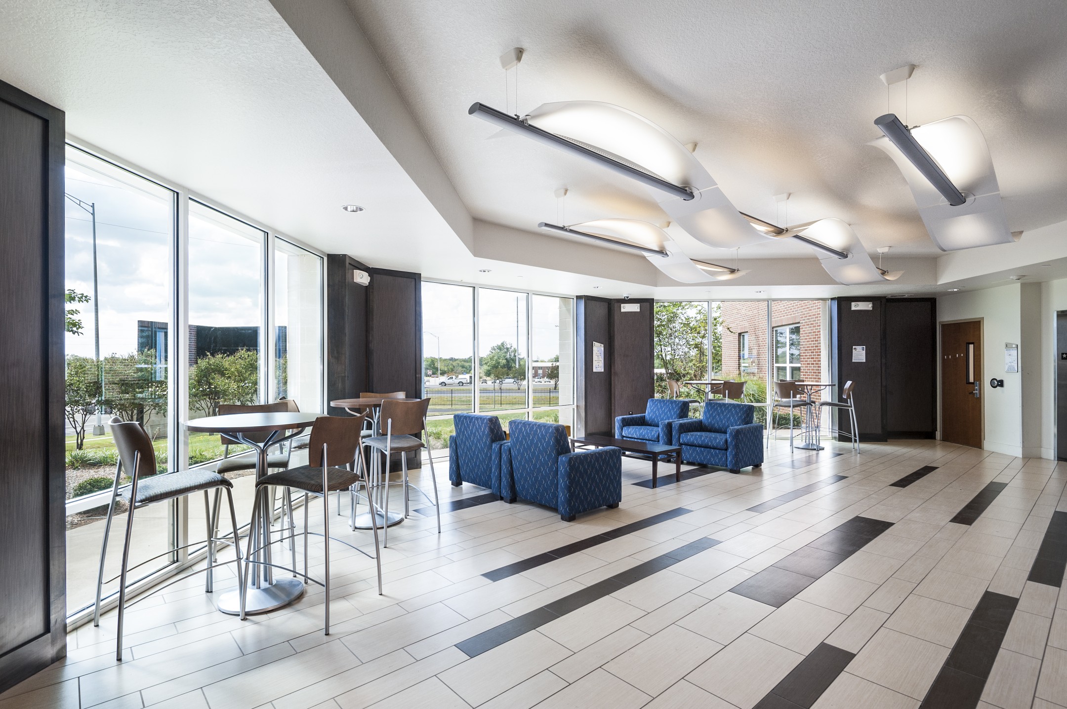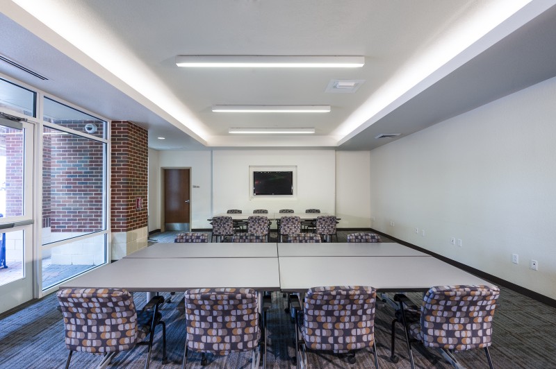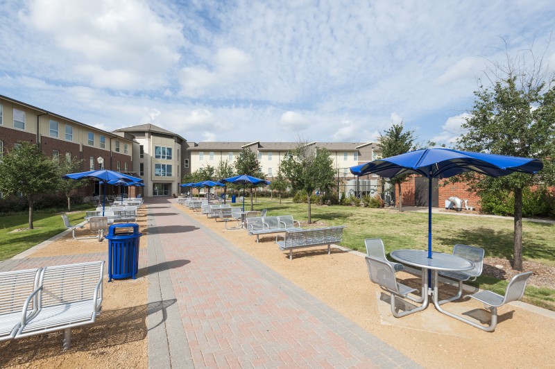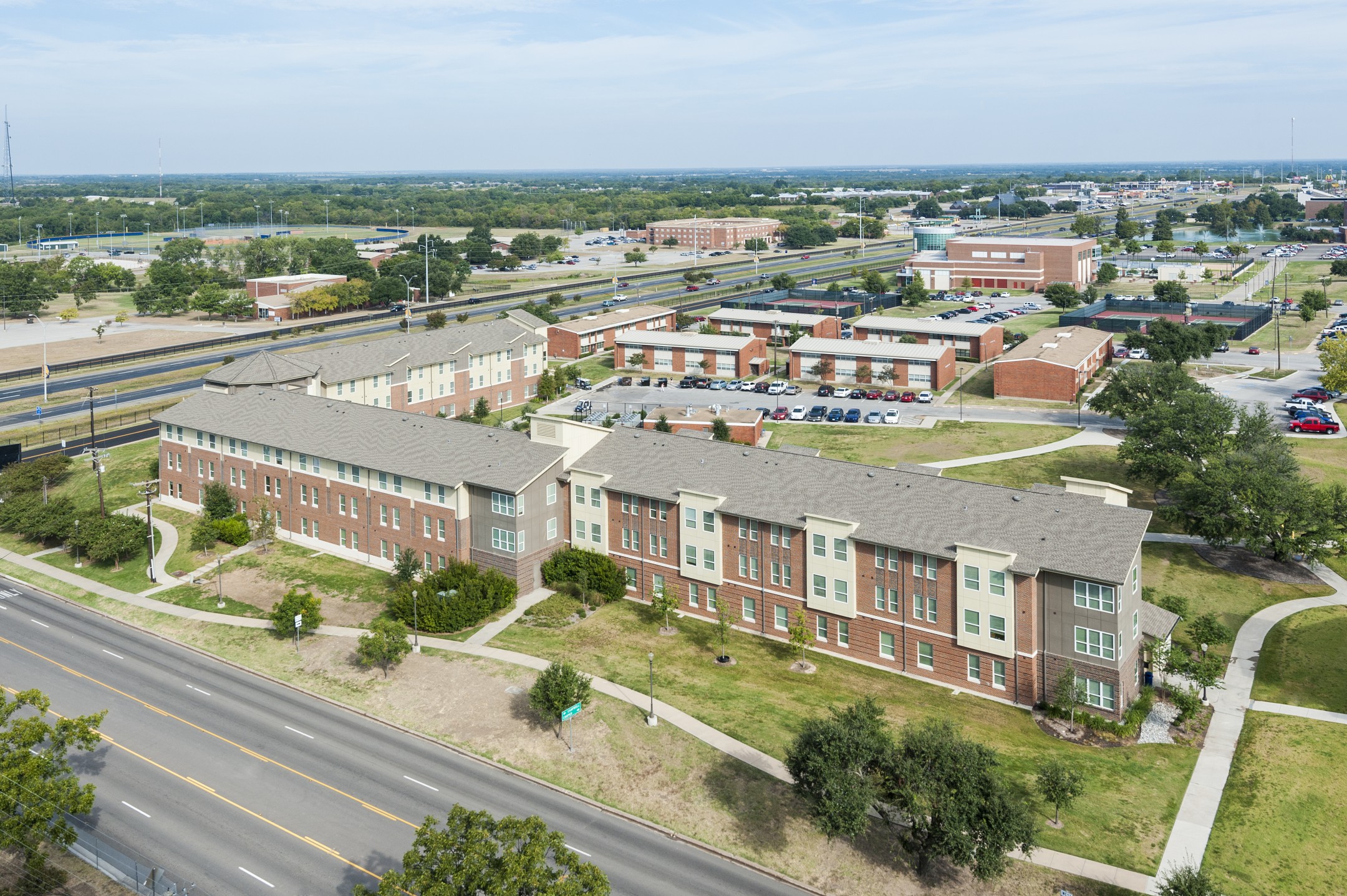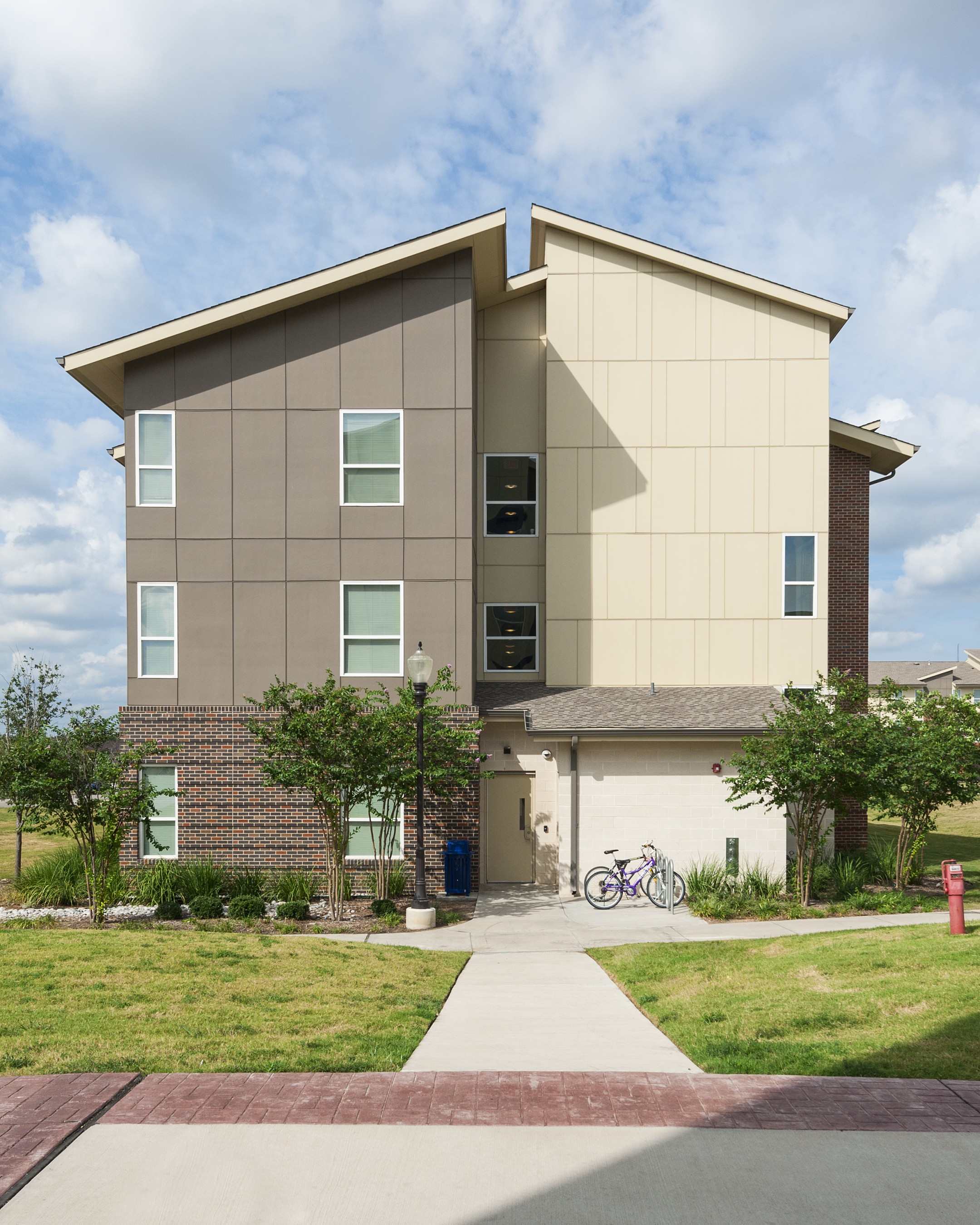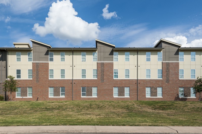 The first phase of student housing at Texas A&M, Commerce, Pride Rock Hall provides a new “front door” to the campus. The buildings create a public courtyard for students, faculty, and visitors and are divided into wings, sharing a common rotunda formed at the most prominent corner of the site. Clearly visible from both public and campus sides of the project, rotundas act as the main public entry into the building and house the student lounges on the second and third floors. Each wing houses 14 to 15 two-bedroom units plus a one-bedroom RA unit on each floor.