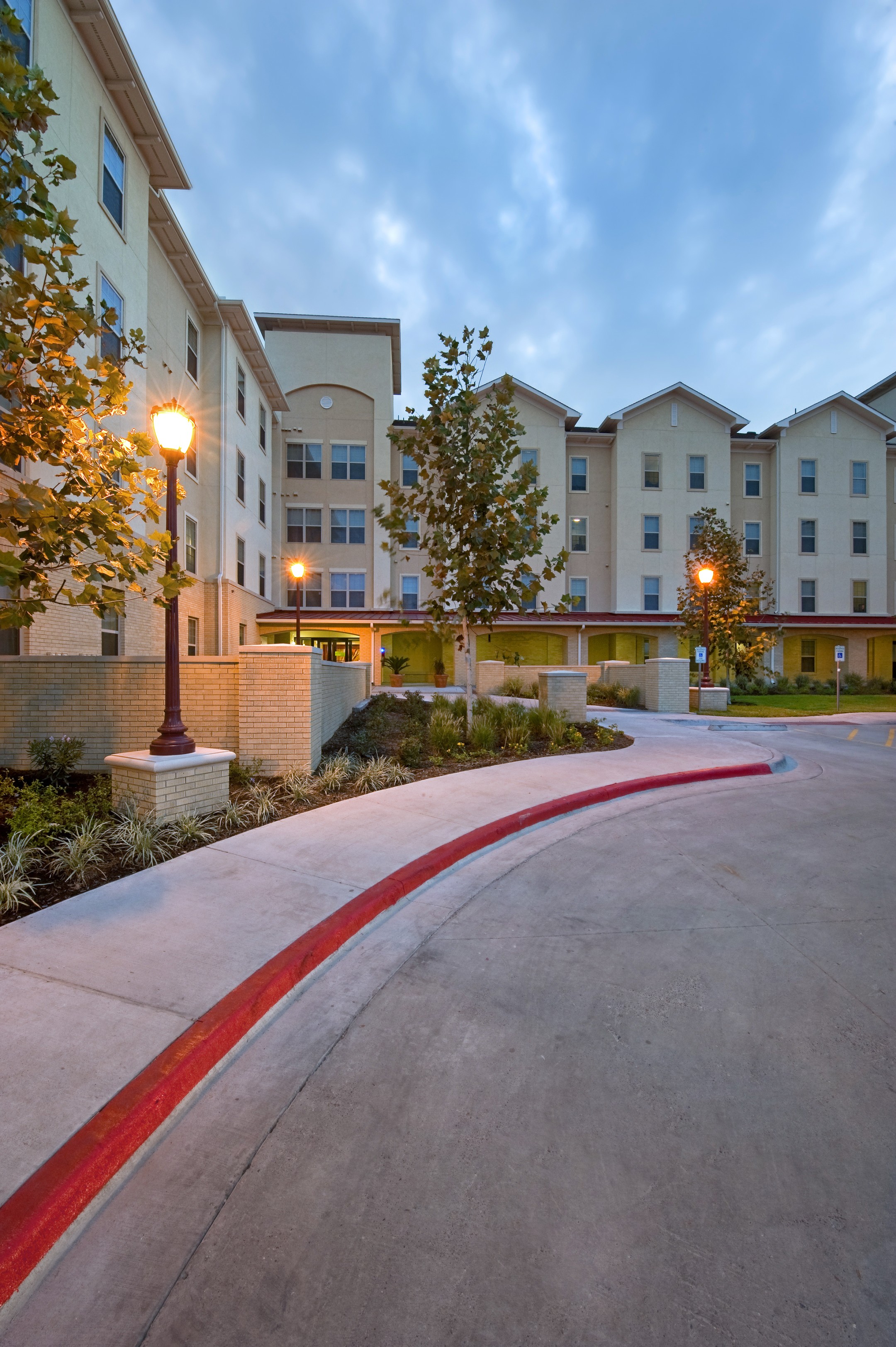 Built in the campus’ traditional mission style, the building includes two- and four-bedroom suites with one or two bathrooms, depending on the design, a living room, and a kitchenette. The living-and-learning environment has study labs, a large lounge, meeting rooms, wireless internet, a full kitchen for student use, laundry facilities, and resident-advisor (RA) apartments.