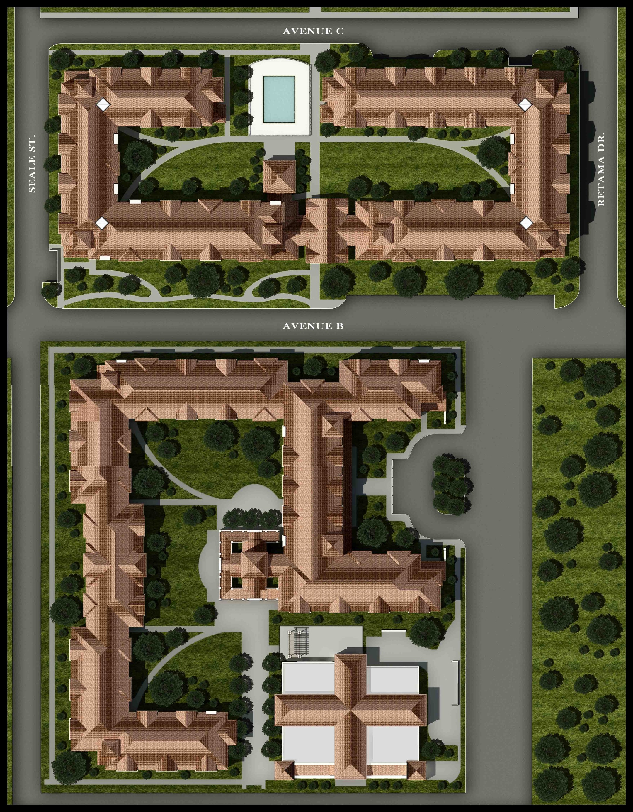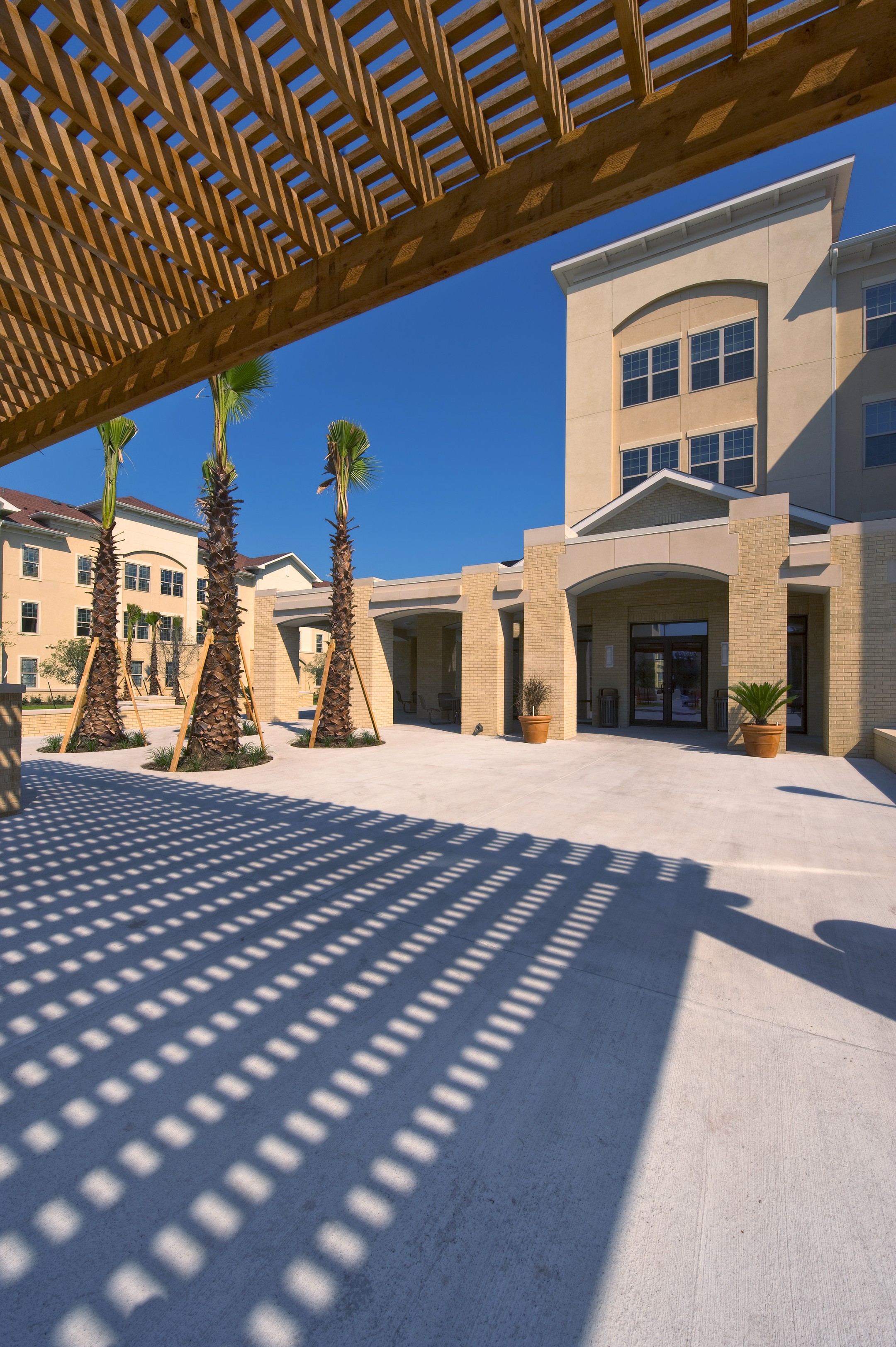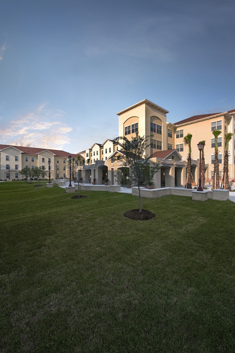 The design includes a large, exterior patio area for college events and a great room and kitchen, which open onto the patio. Phase II has accents of Spanish provincial tiles and colors, which draw on the heritage of the south Texas region. Phase III includes a swimming pool adjacent to the great room and exterior patio, which provides a continuous flow between spaces.
