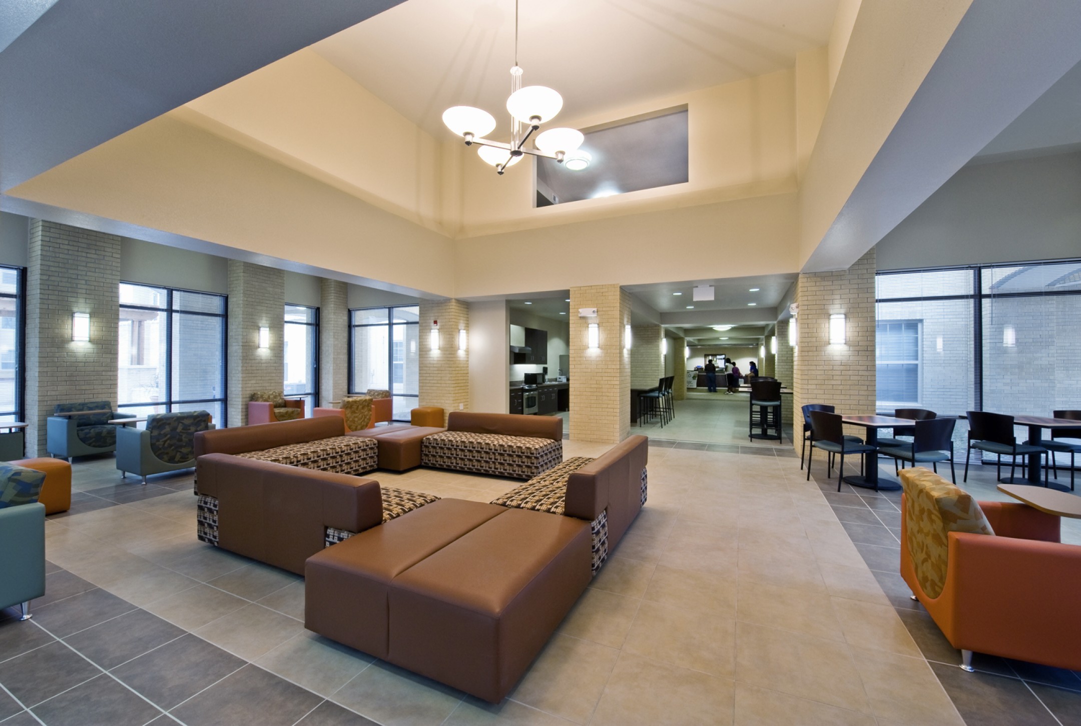 Among the auxiliary areas included in each phase are resident advisor (RA) living quarters, multiple study rooms, lounge and meeting areas, and residence-life offices and varied amenities such as wireless internet access, a fitness center and laundry facilities.