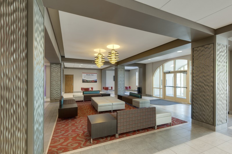 The residence hall adjoins a new two-story, 22,000-square-foot dining hall, three exterior courtyards, and new parking lots built to accommodate the new residents and facility users.