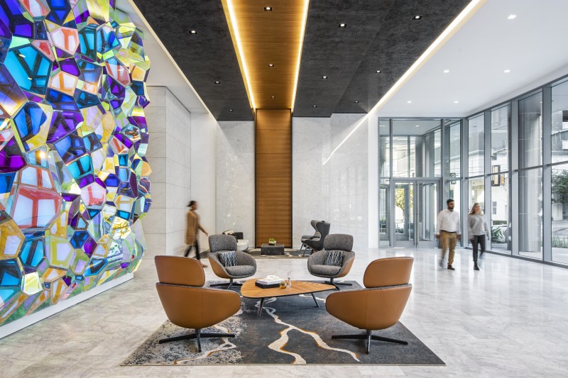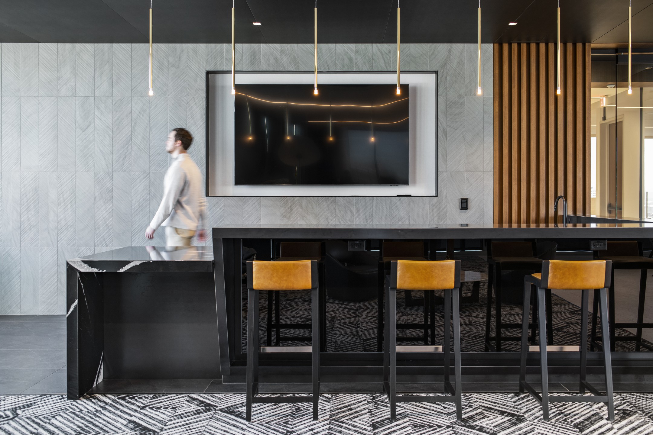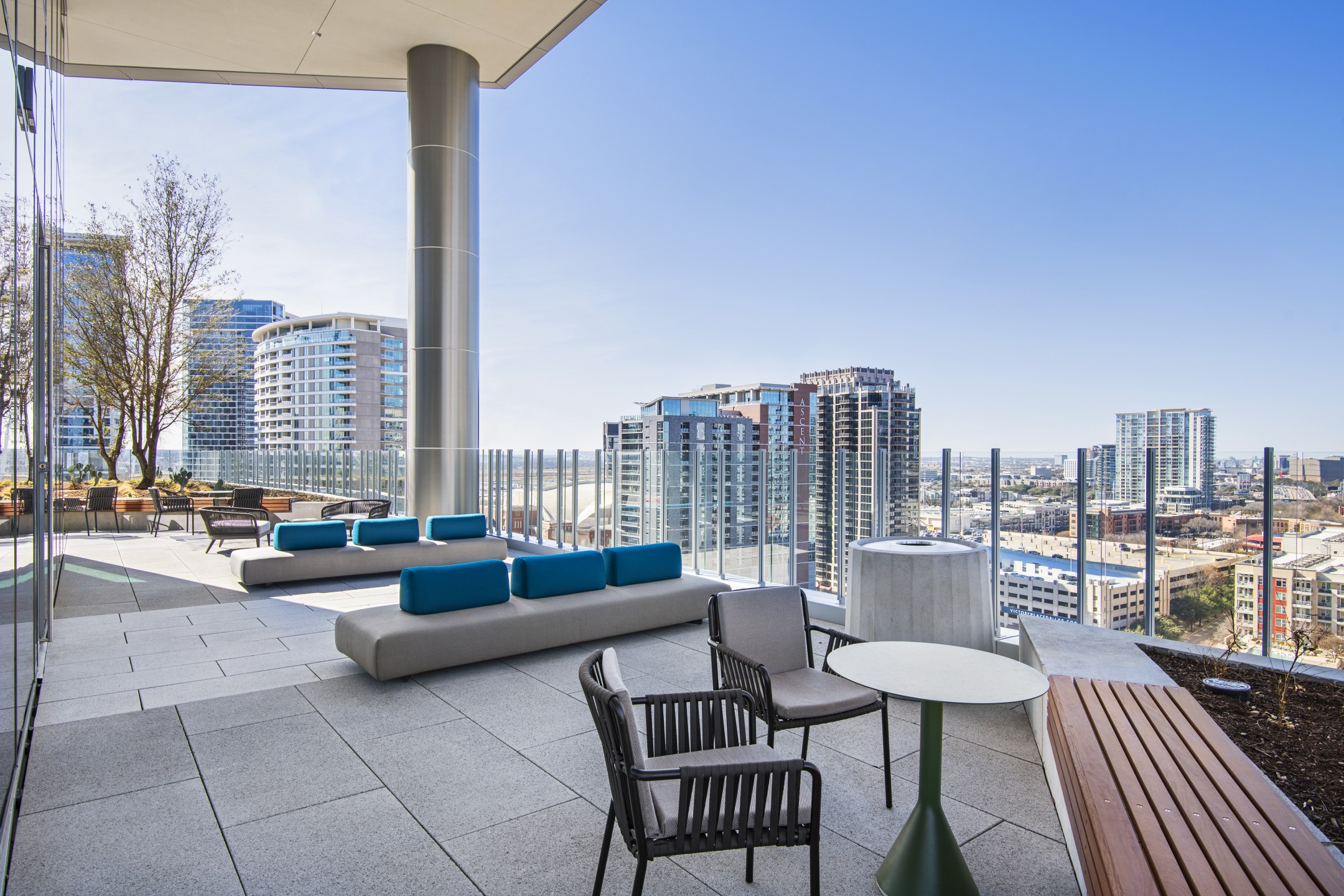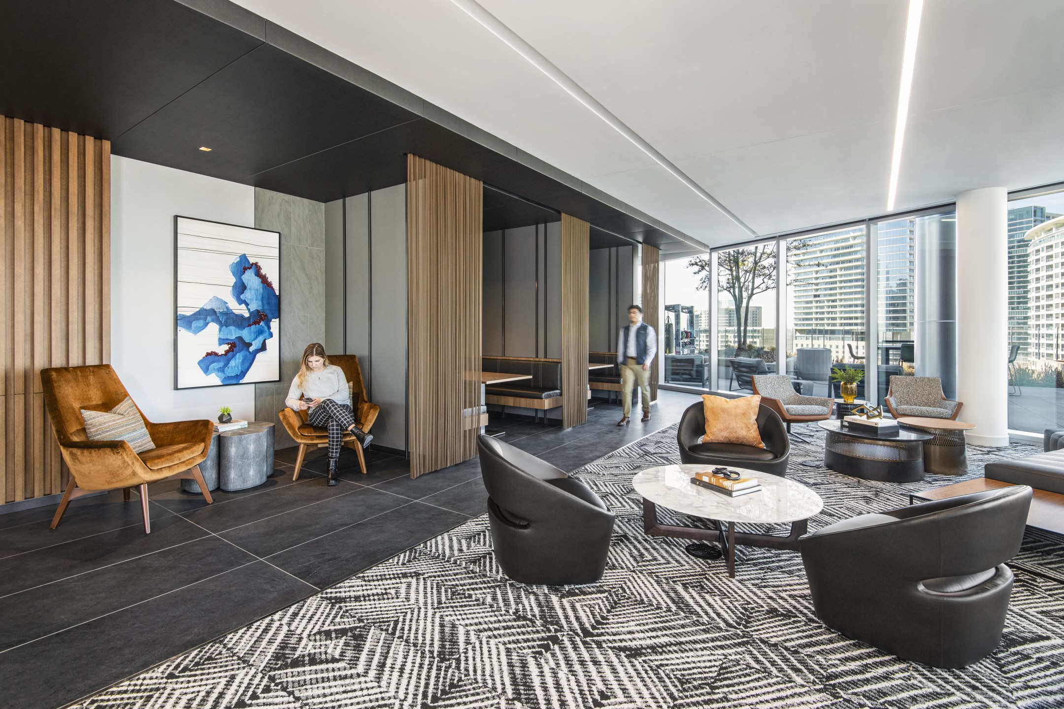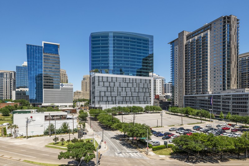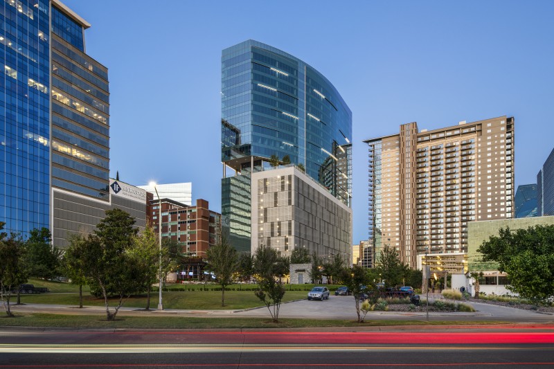The Link at Uptown is a 25-story, Class AA office building, on a high profile site, connecting two vibrant areas of Dallas: Victory Park and Uptown. Each office floor provides stunning views of the American Airlines Center and its surrounding development. Sections of the garage are clad to match the glass façade of the office building, which is strategically designed to curve along the restrictive site boundaries. The ground floor lobby is set back to provide a welcoming entrance and access to two ground-floor restaurants. A 12th floor sky lounge offers nearly 20,000 square feet of indoor and outdoor tenant amenity spaces including a full-service fitness center, conference and training center, executive overnight suites, lounge space, and pop-up lunch options.