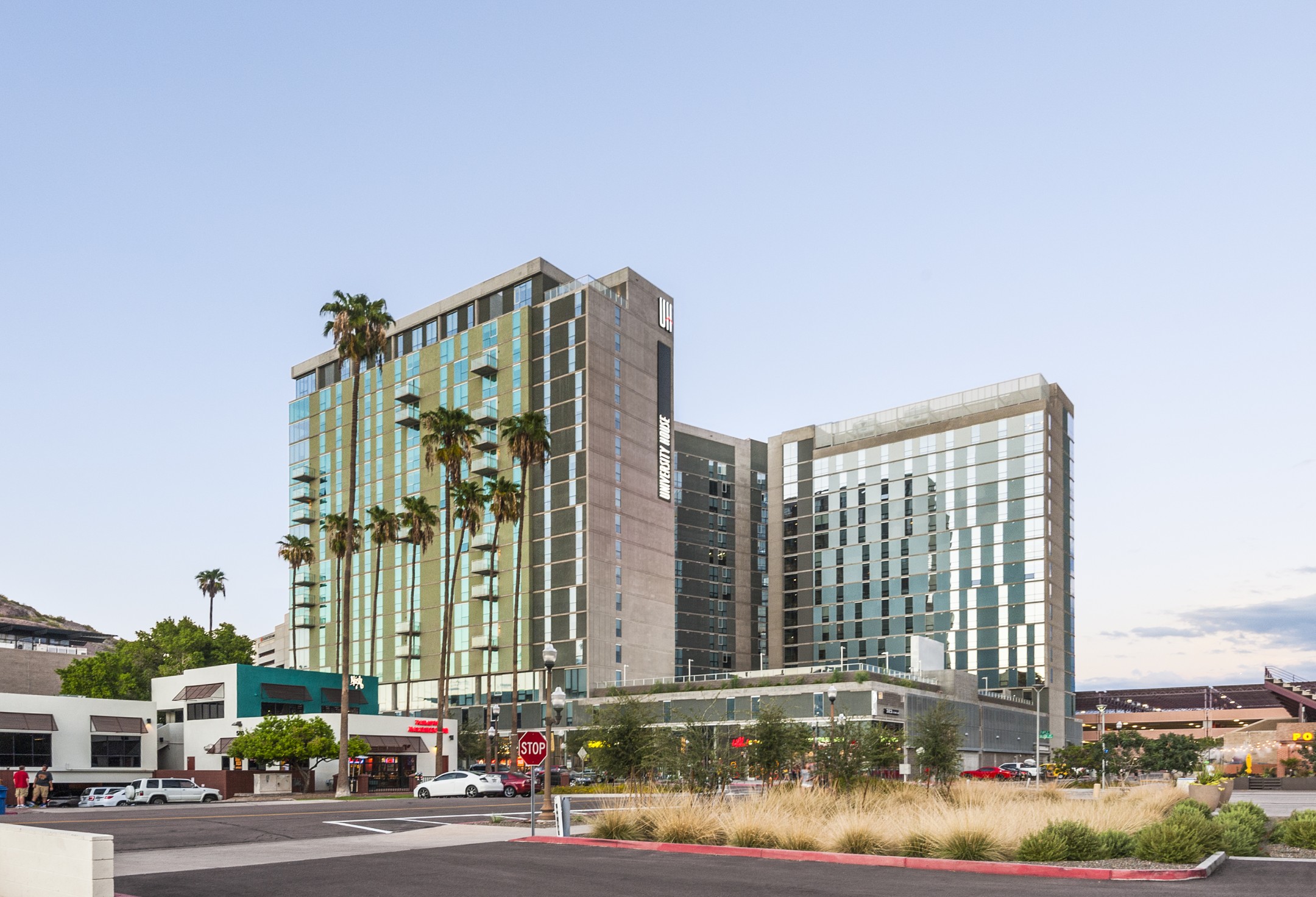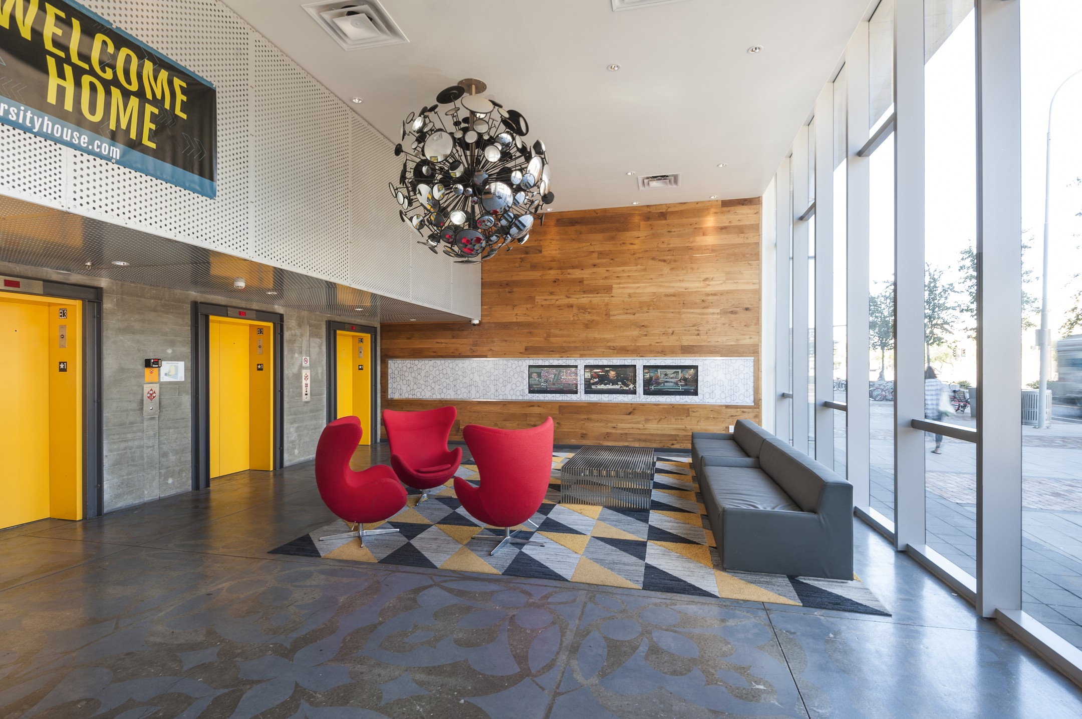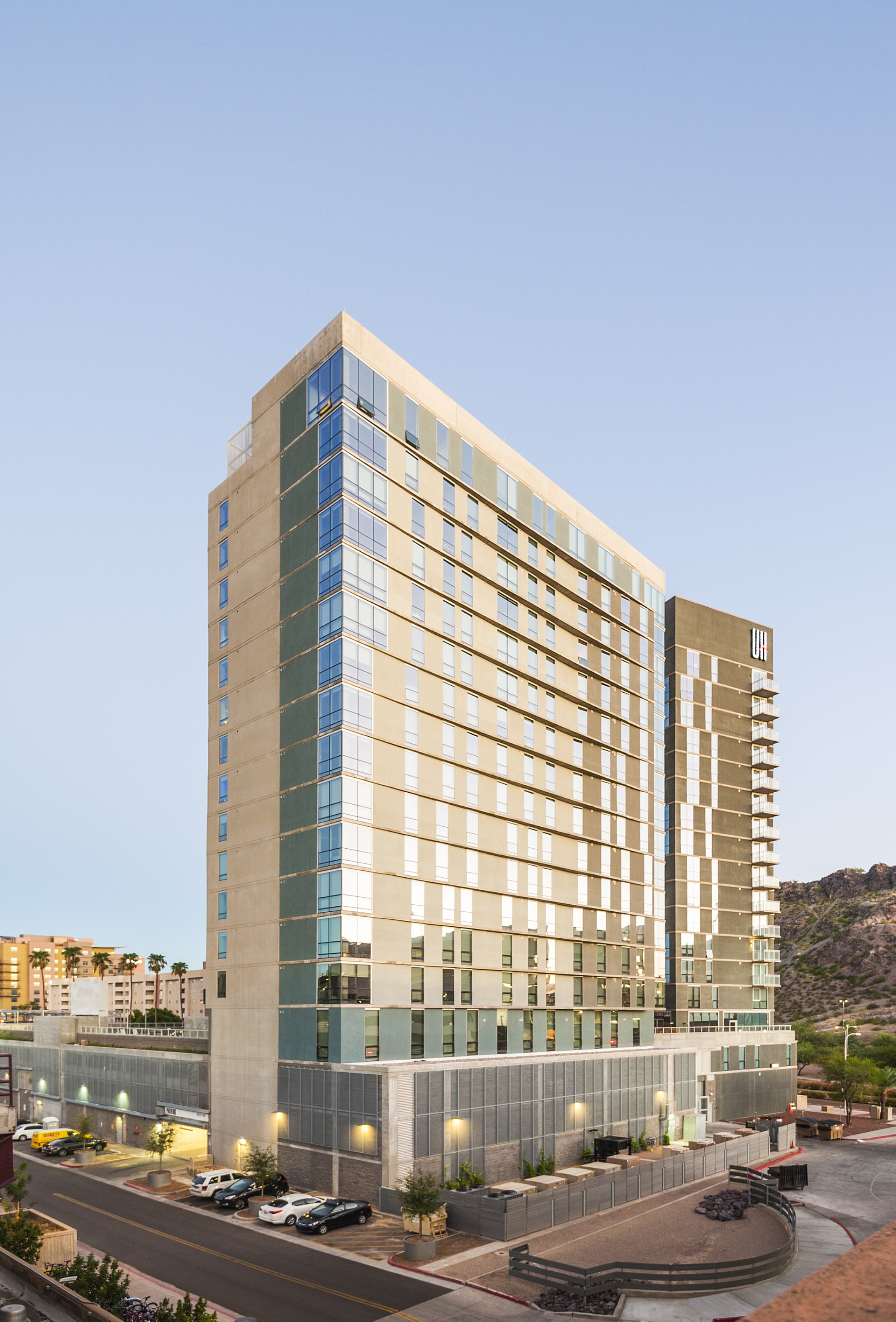 University House Communities opened the second phase of University House, a private luxury student housing development on the Arizona State University campus, in the fall of 2015. BOKA Powell designed the tower to complement an existing adjacent first phase. The project includes 242 beds with two, three, and four bedroom options. University House represents a new trend in luxury student housing, with top-of-the-line features including nine-foot exposed concrete ceilings, porcelain tile bathrooms, and full-sized washers and dryers. Apartments range from 716 to 1,289 square feet, with modern, fully equipped kitchens. Each unit has floor-to-ceiling windows that provide panoramic views of the Sun Devil Stadium across the street. Units are available to students for nine and 12-month leases, and are move-in ready with platform beds, kitchen and living room furniture.