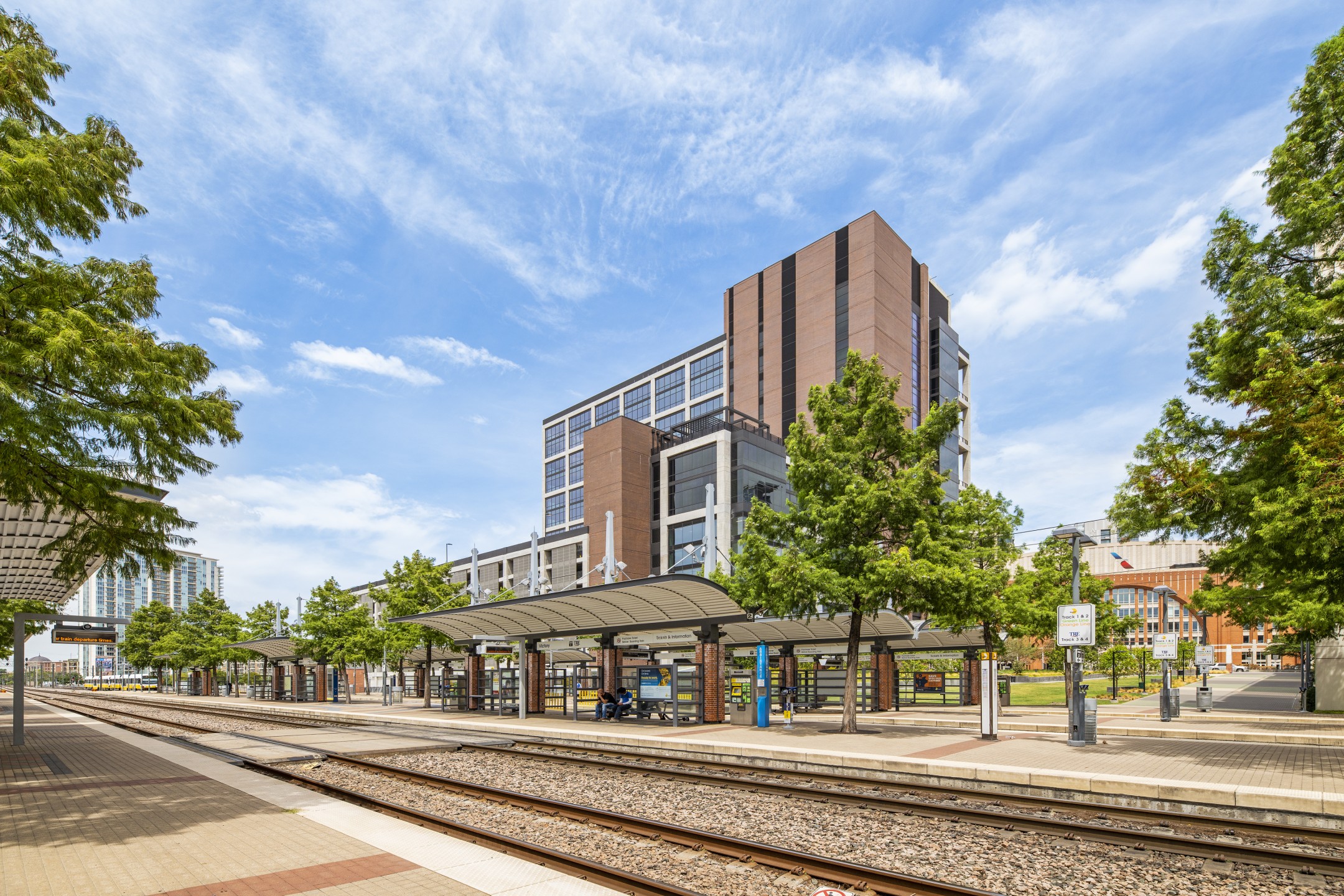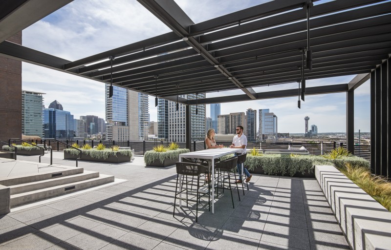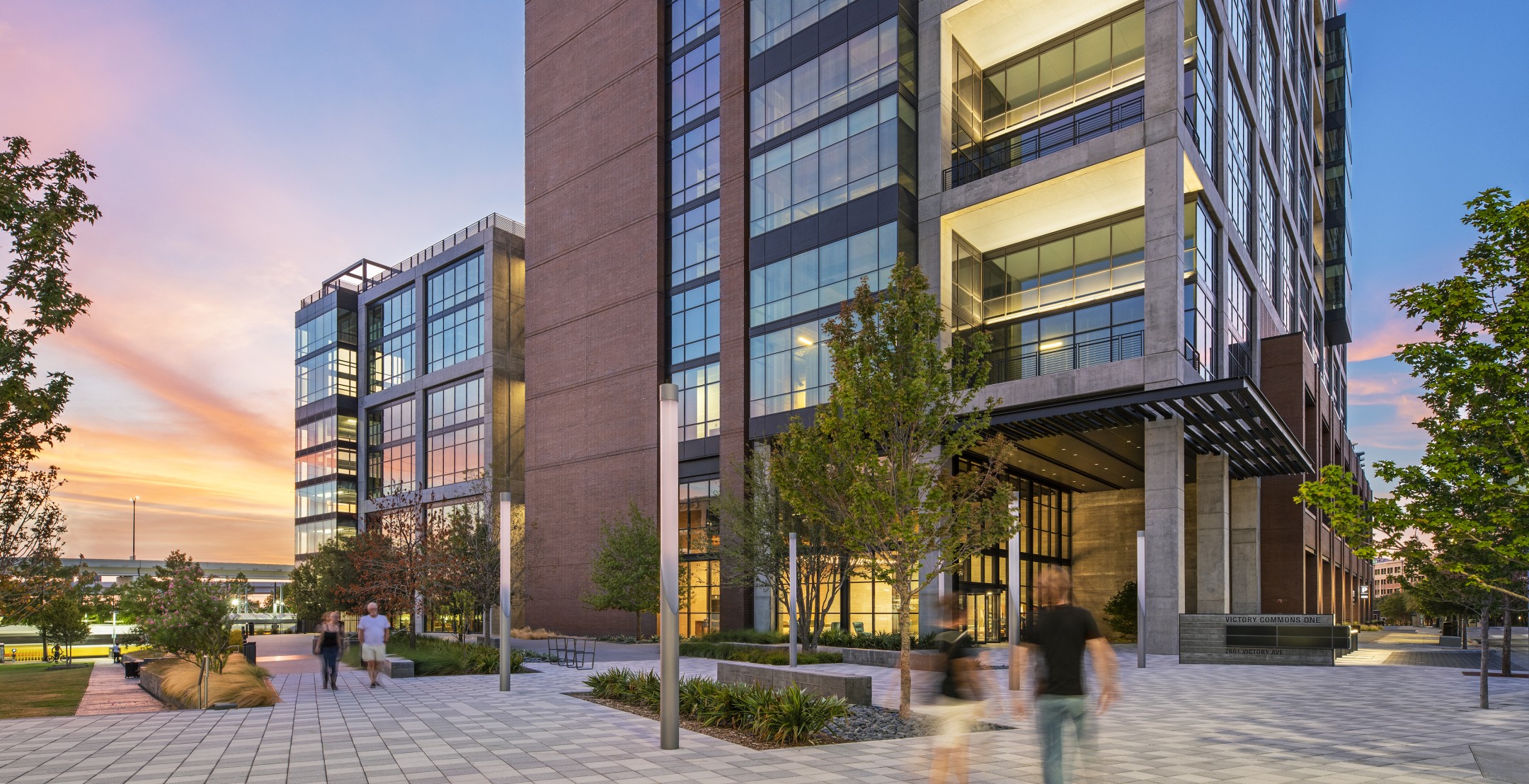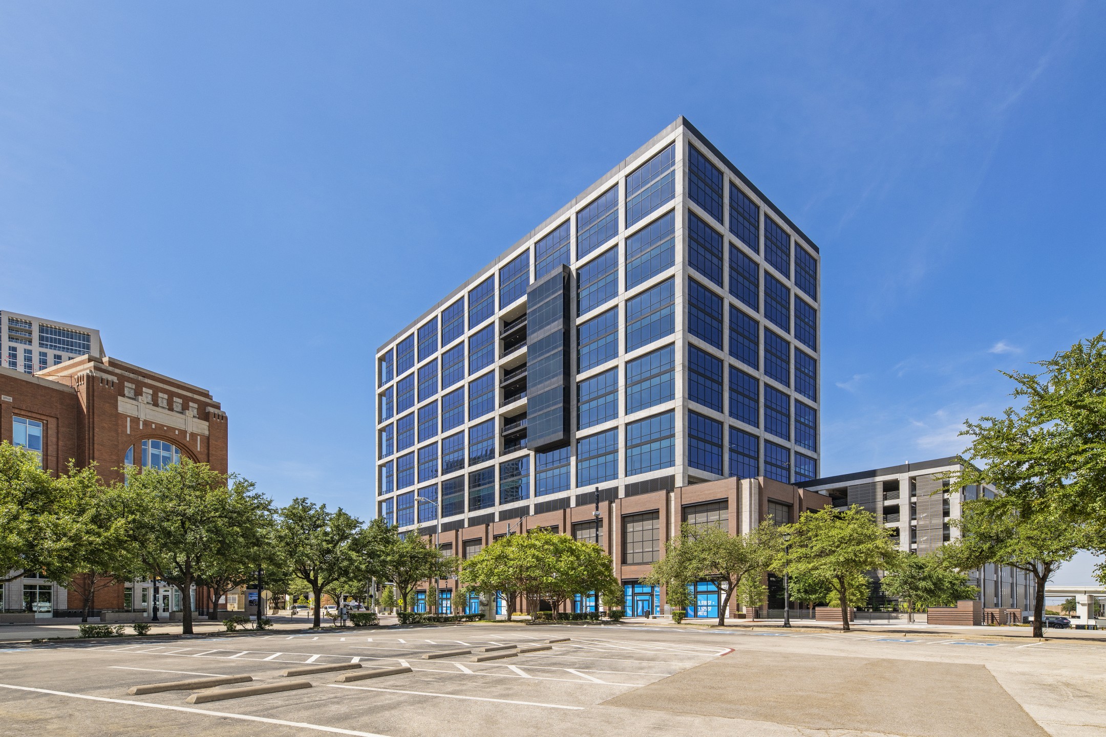 Located next to the DART light rail station and a one-acre park, the brick, concrete, and steel building is directly across the street from the American Airlines Center Arena. Victory Commons features large floor plates with a unique side-core design that allow tenants to incorporate flexible workplace design strategies. Balconies offer views of Victory Park, Uptown Dallas, and the Central Business District. A lush roof terrace overlooks Victory Park and the Design District, while ground-floor retail and outdoor seating invite users to enjoy lively shops and restaurants.